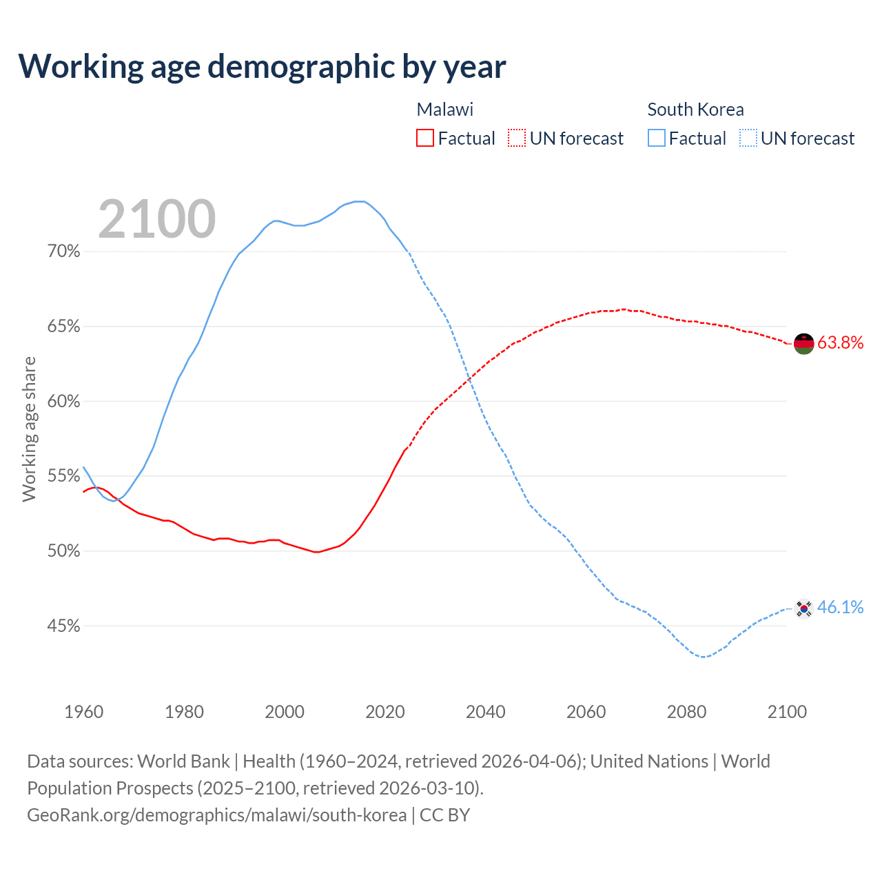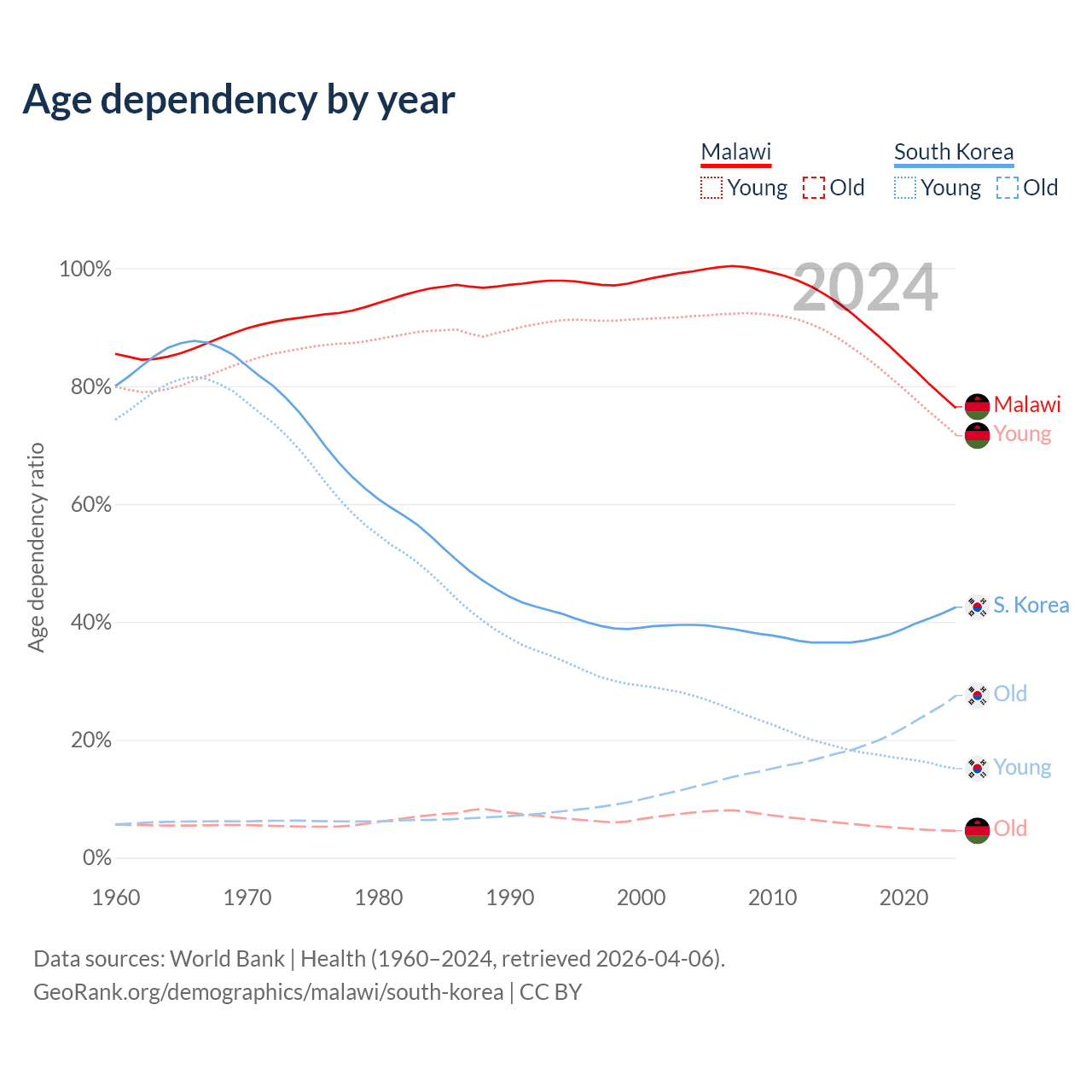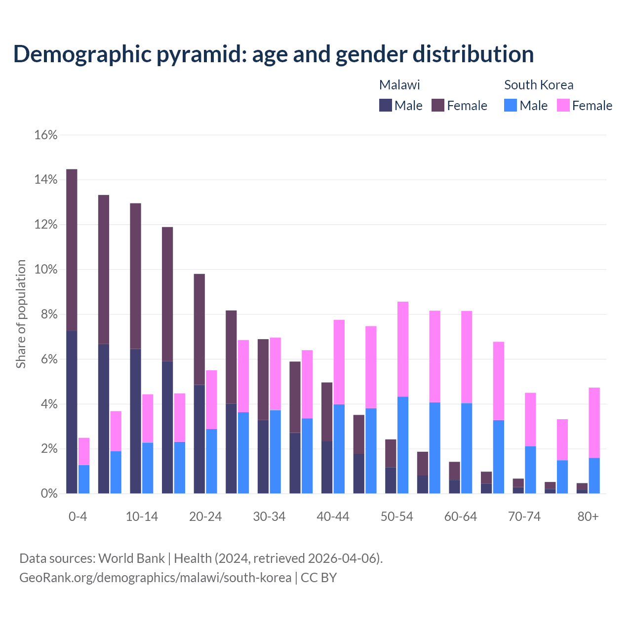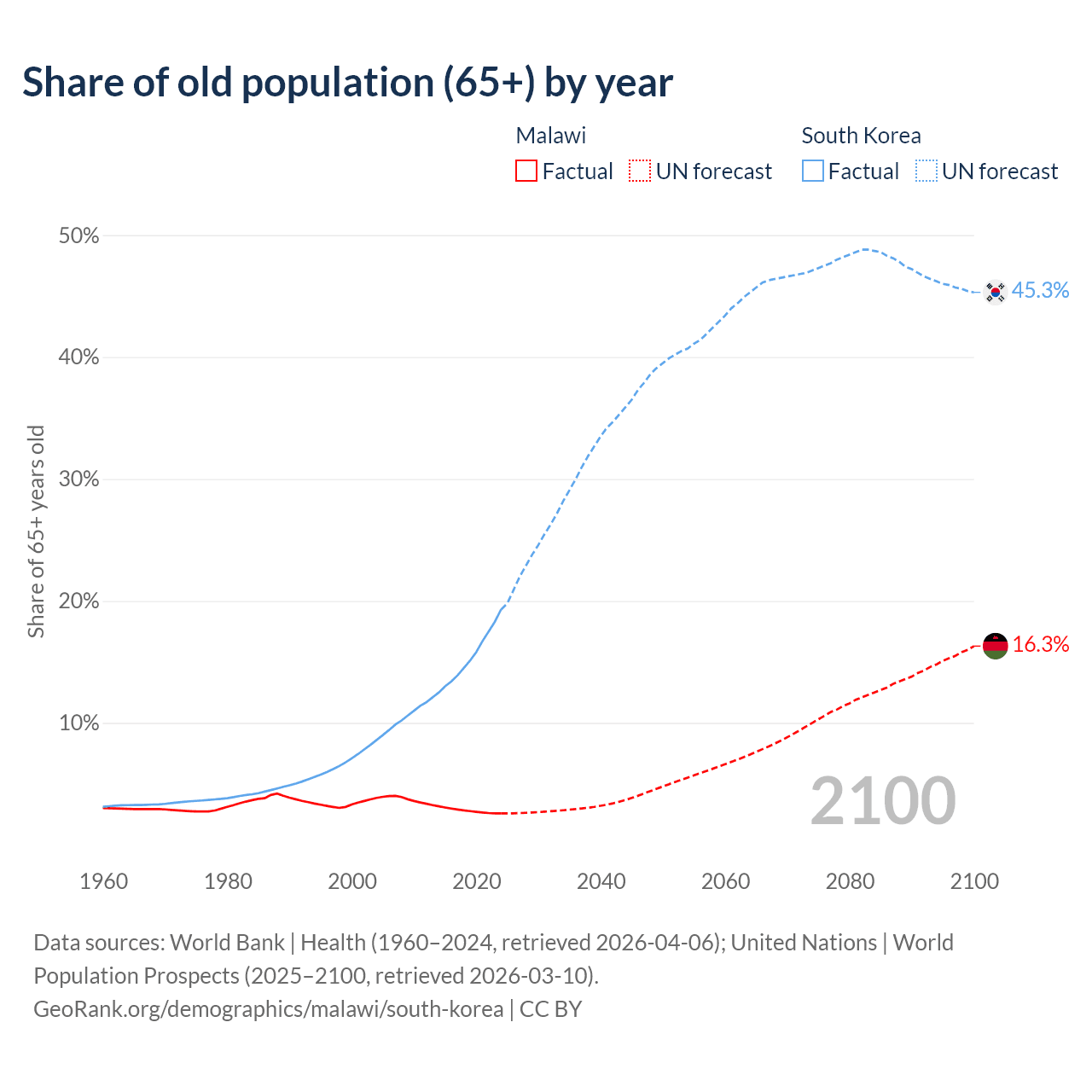 The share of older people aged 65 and over is 2.59% in Malawi and 19.3% in South Korea. Life expectancy in Malawi compared to South Korea .