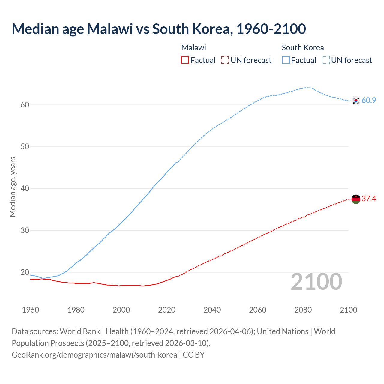 Median age Malawi vs South Korea, 1960-2100