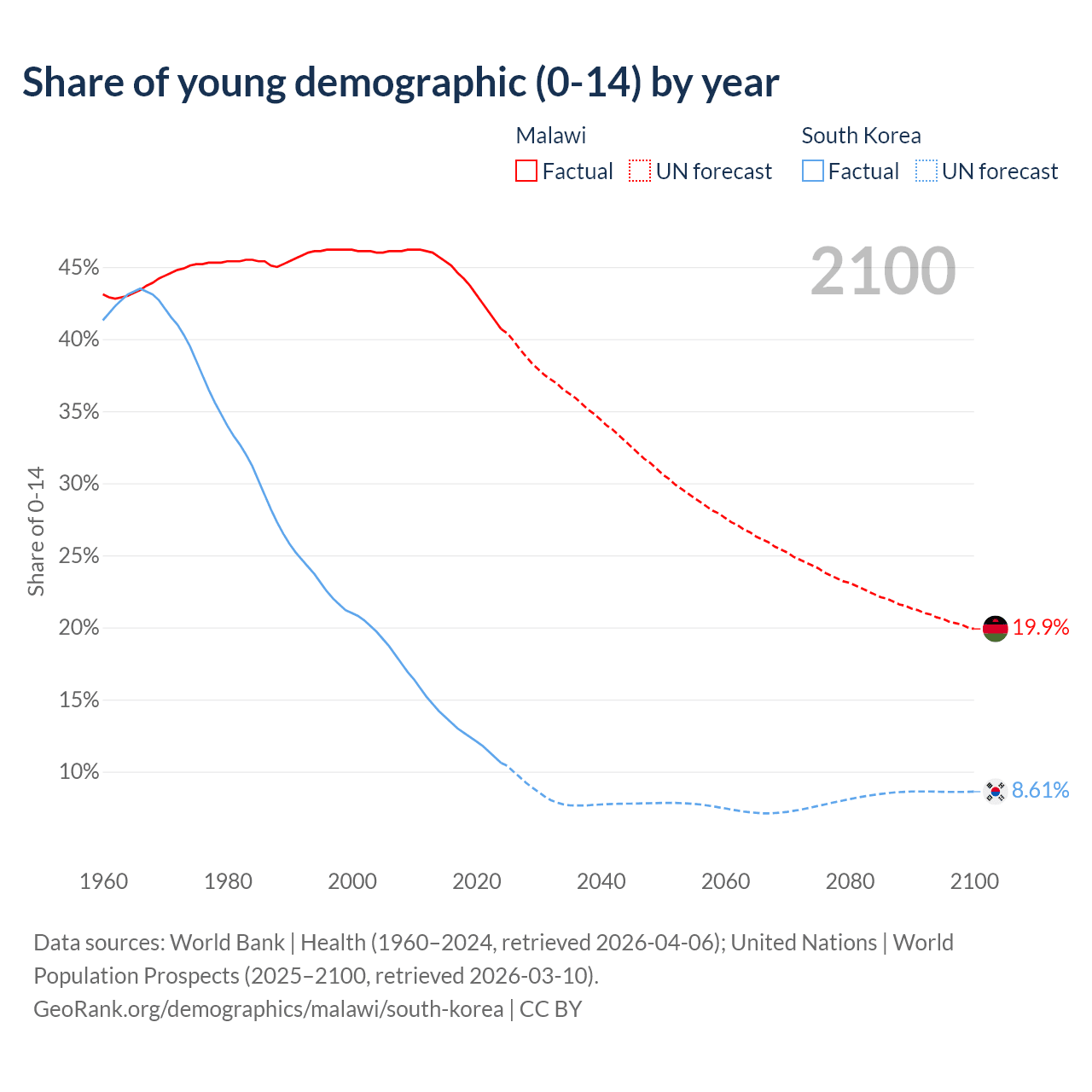 - The share of young demographic (0-15 years old) in Malawi is 40.7% vs 10.6% in South Korea.