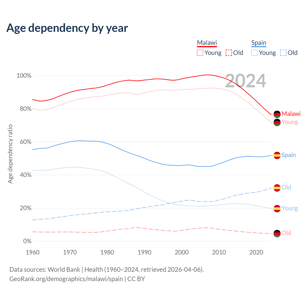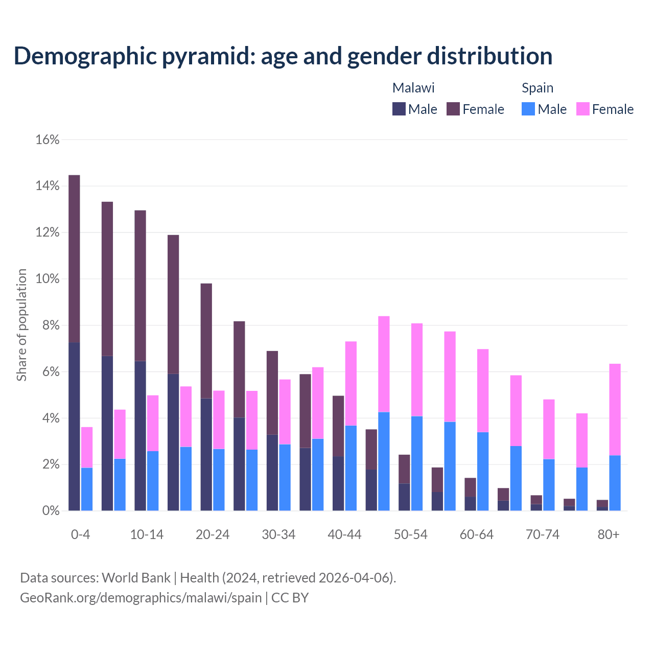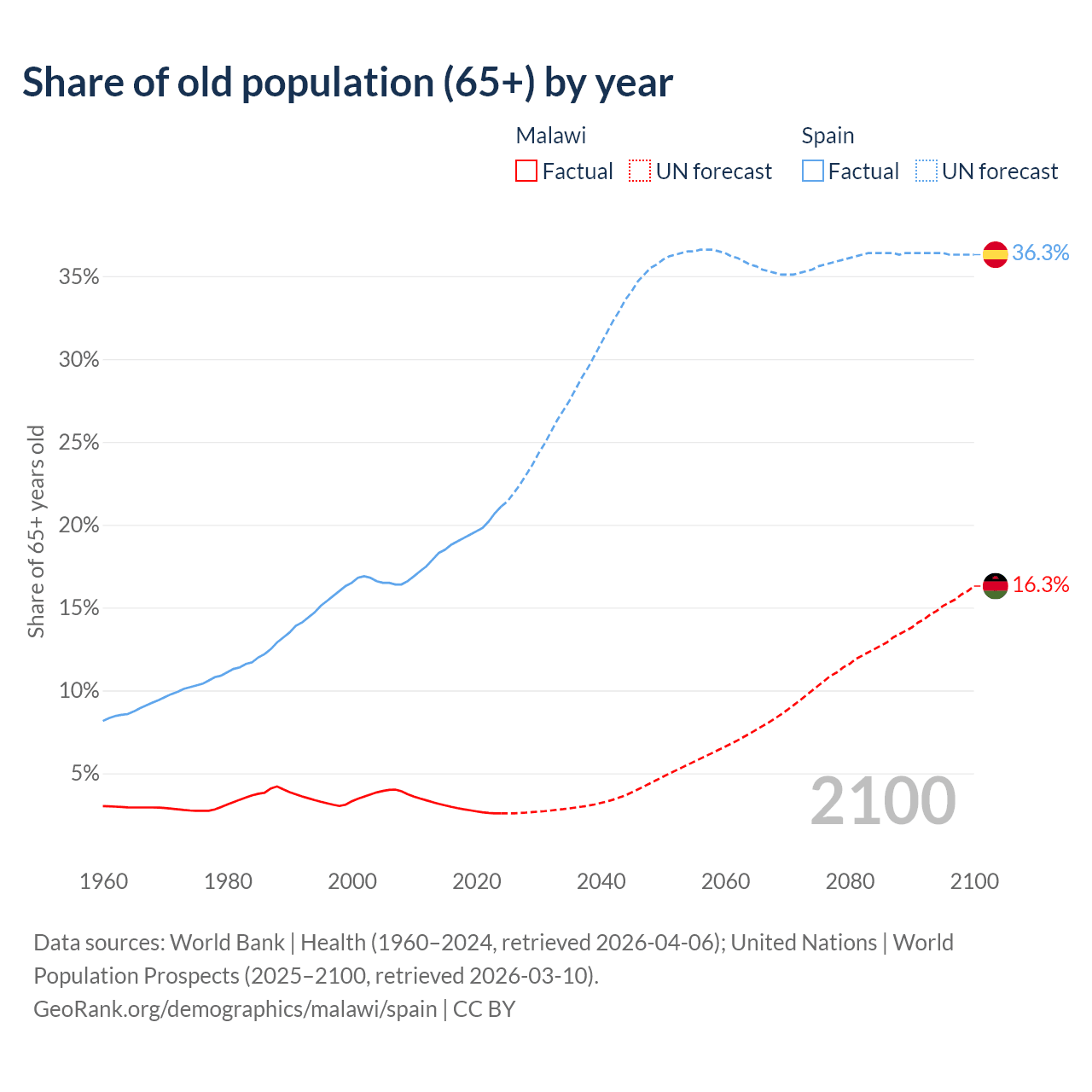 The share of older people aged 65 and over is 2.59% in Malawi and 21.1% in Spain. Life expectancy in Malawi compared to Spain .