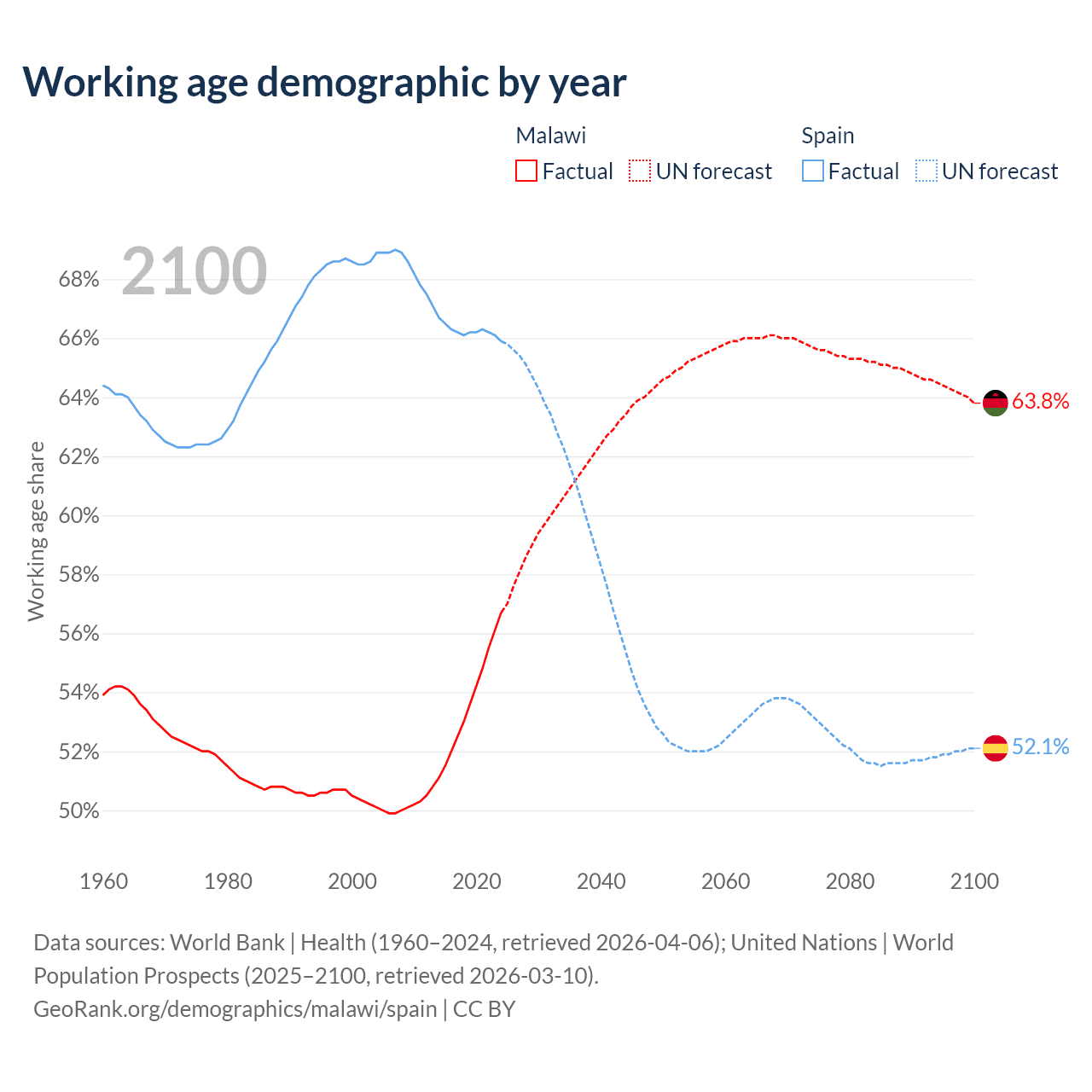 - Malawi has 13M working age adults (aged 15-64) vs 32.2M in Spain.