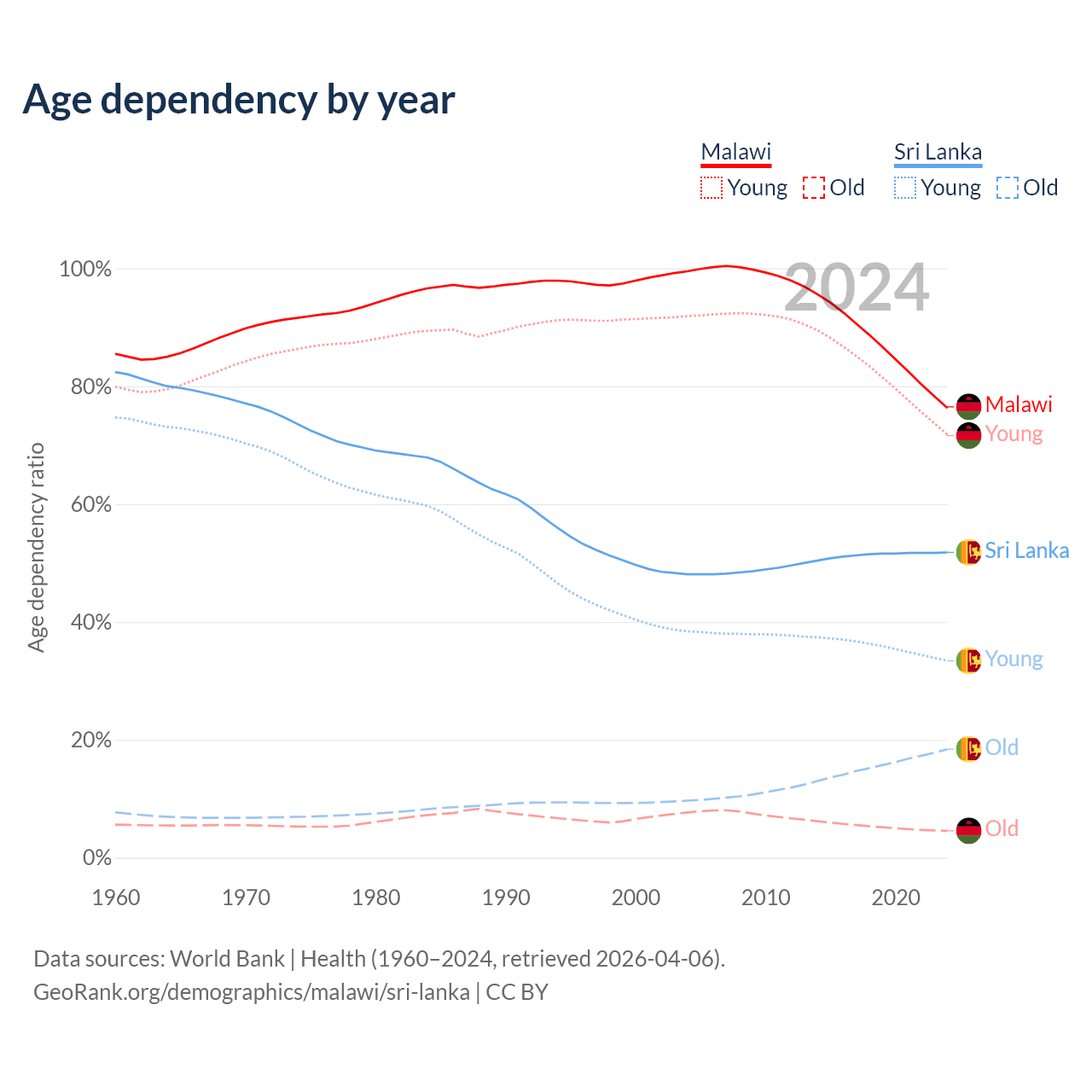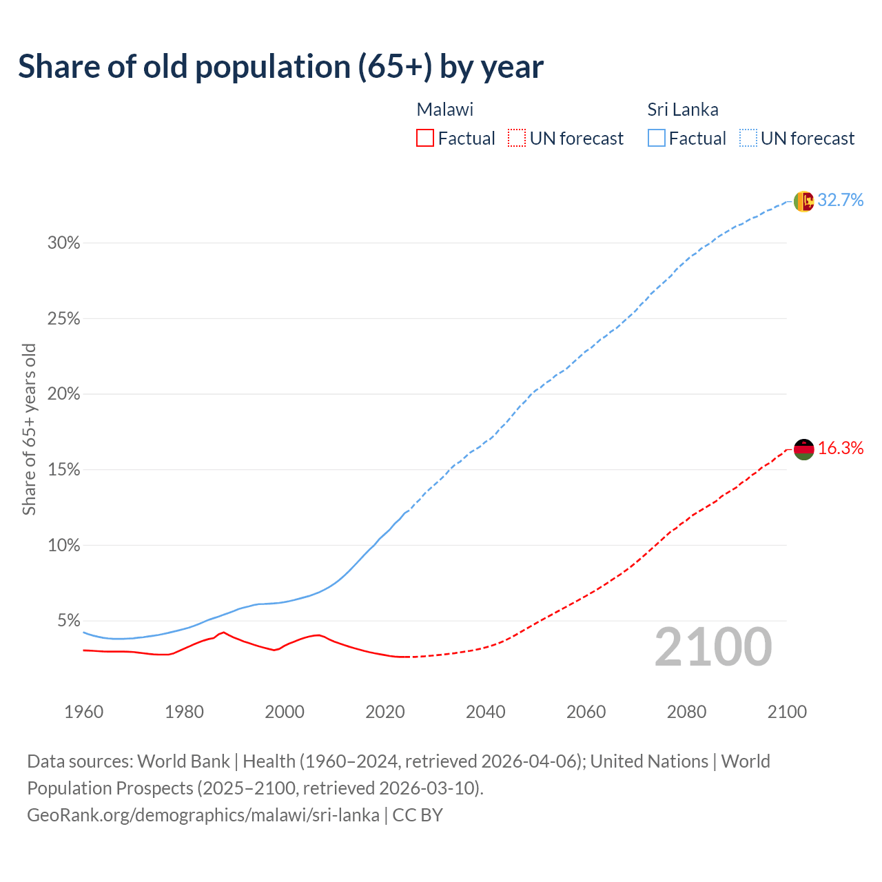 The share of older people aged 65 and over is 2.59% in Malawi and 12.1% in Sri Lanka. Life expectancy in Malawi compared to Sri Lanka .