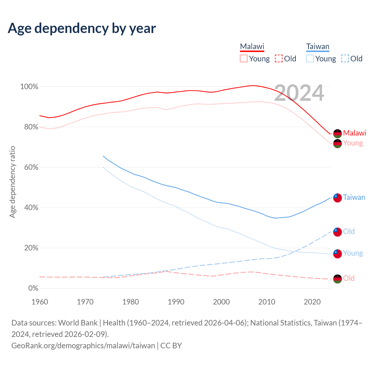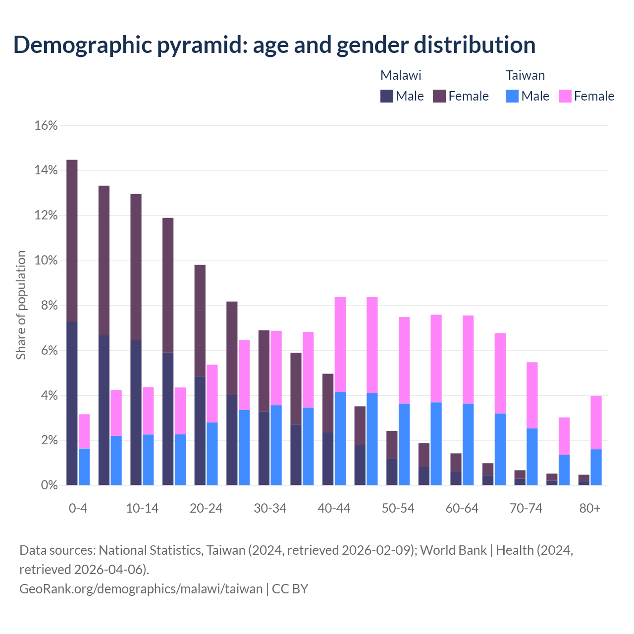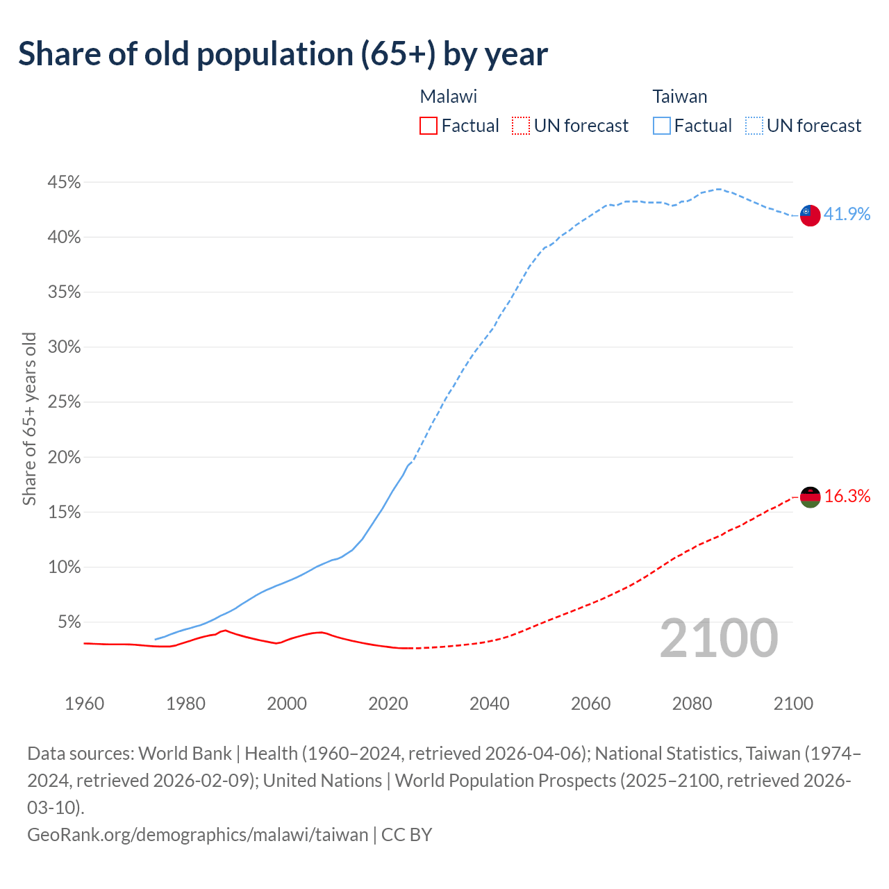 The share of older people aged 65 and over is 2.59% in Malawi and 19.2% in Taiwan. Life expectancy in Malawi compared to Taiwan .