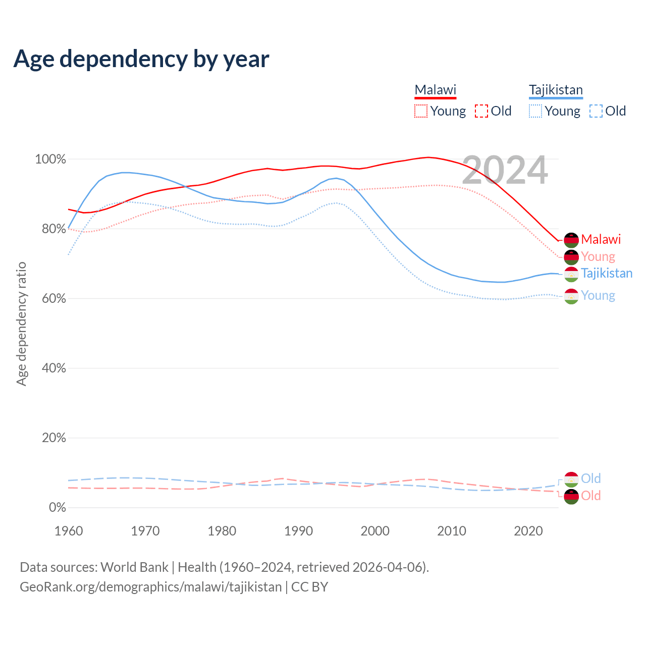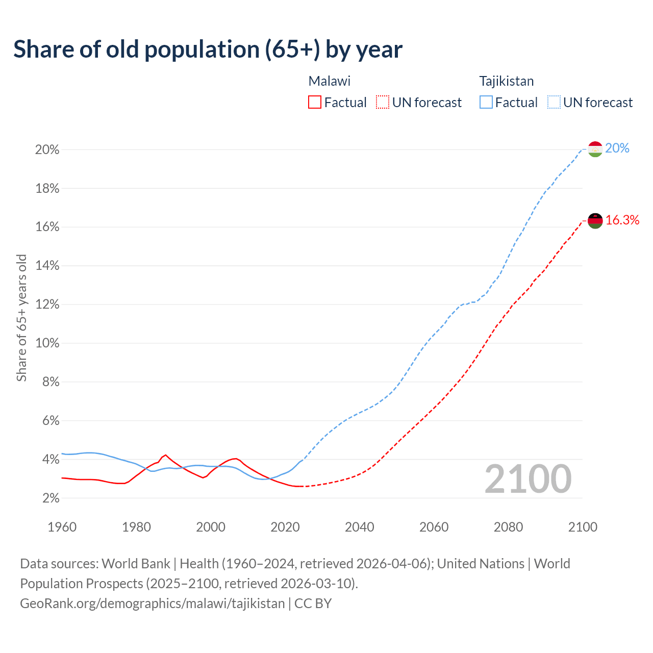 The share of older people aged 65 and over is 2.59% in Malawi and 3.85% in Tajikistan. Life expectancy in Malawi compared to Tajikistan .