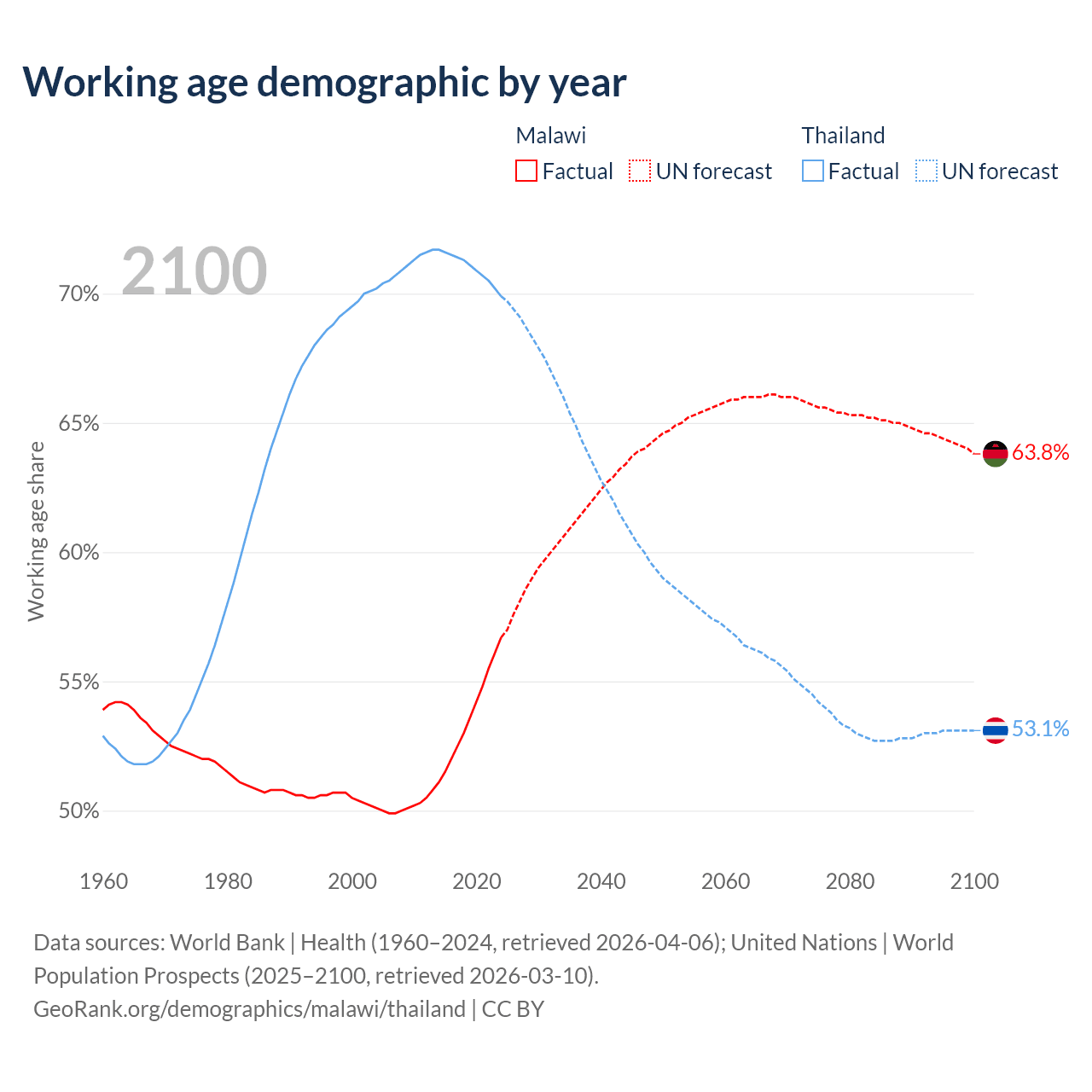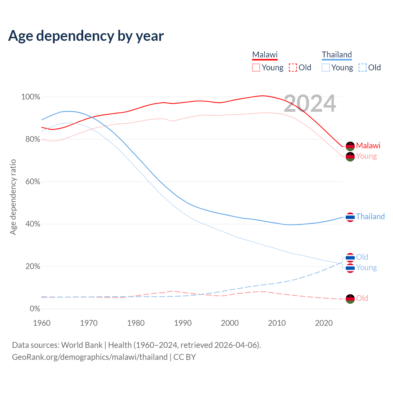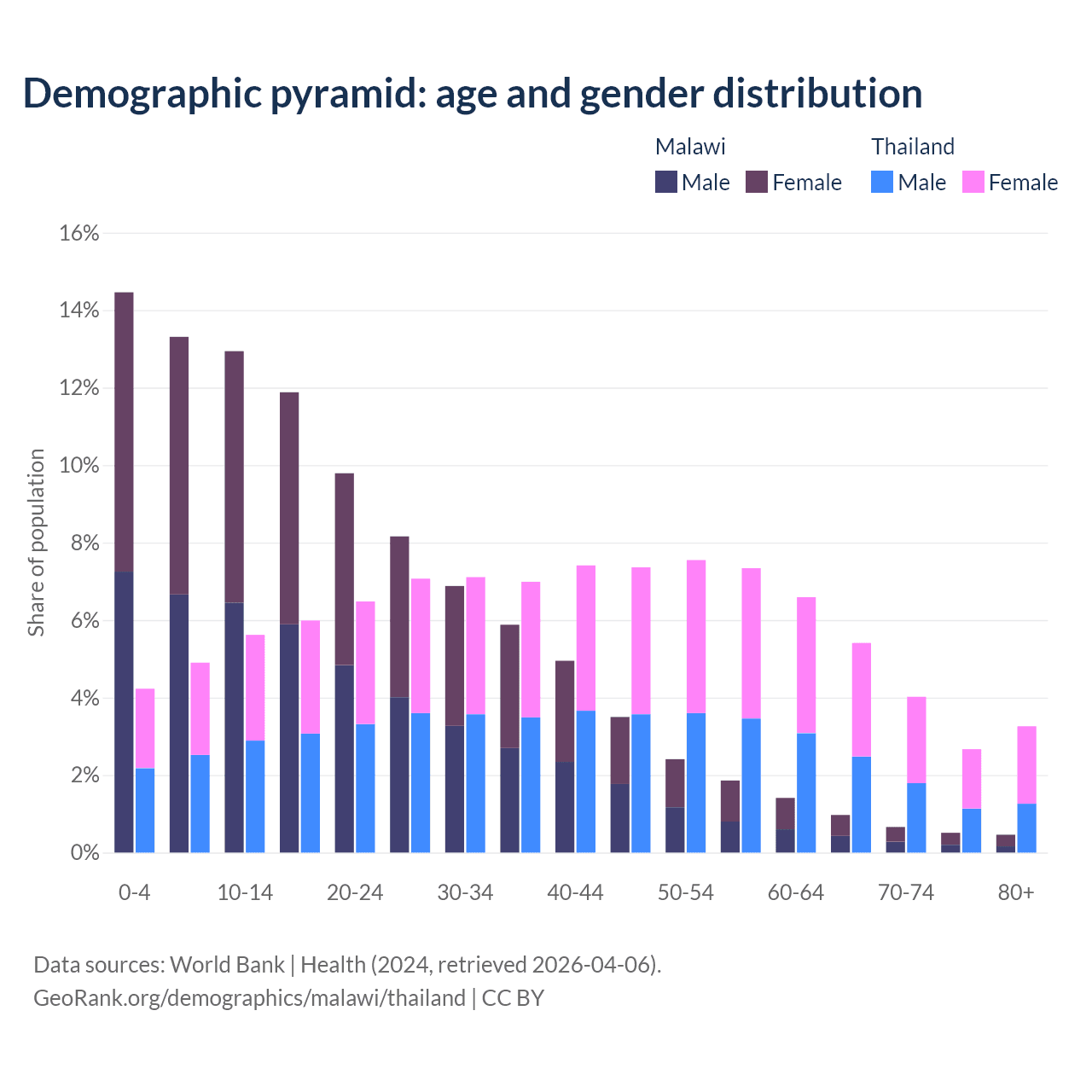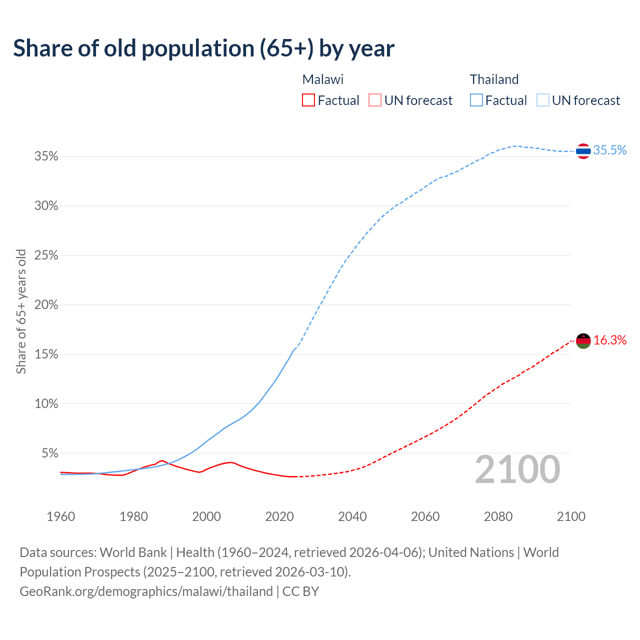 The share of older people aged 65 and over is 2.59% in Malawi and 15.4% in Thailand. Life expectancy in Malawi compared to Thailand .