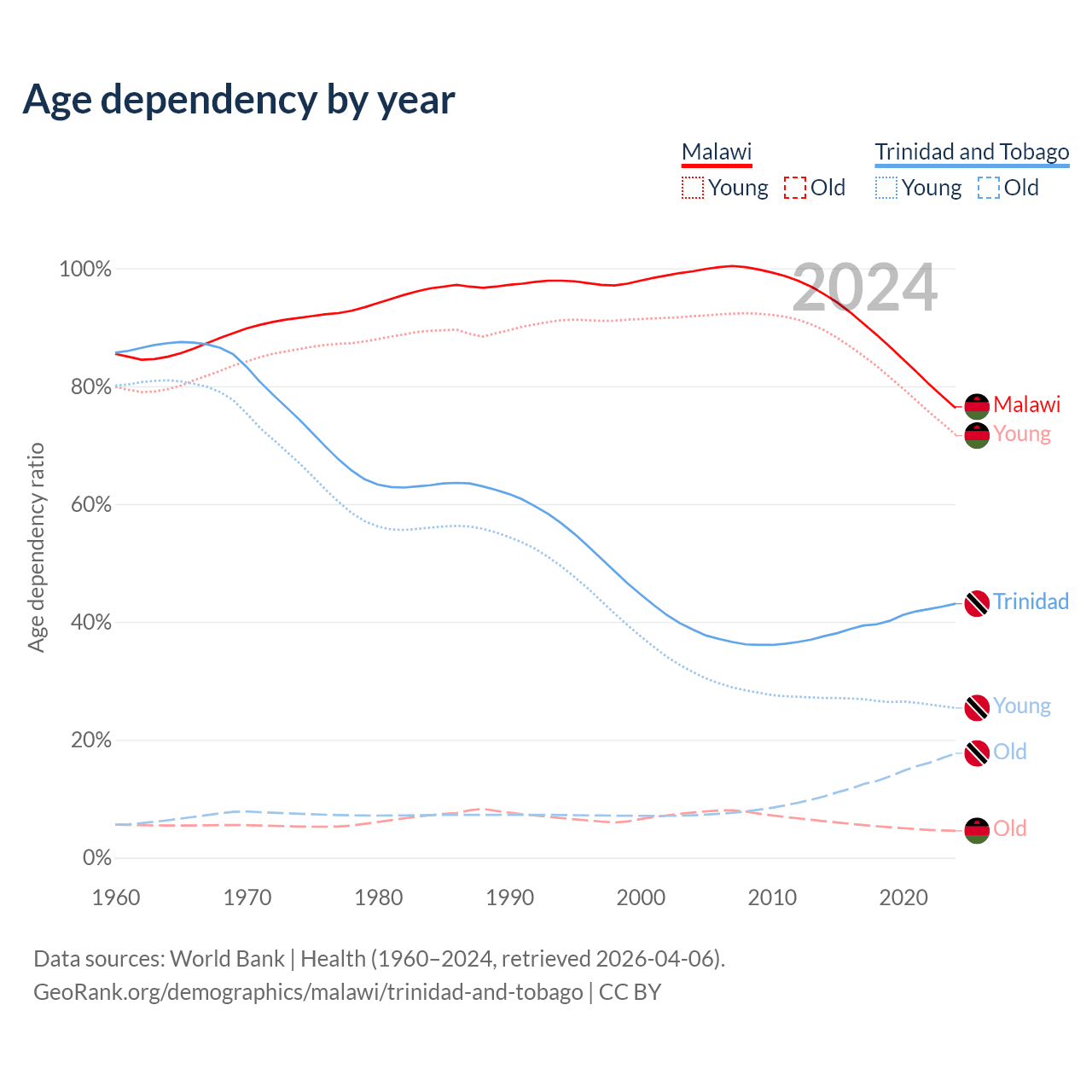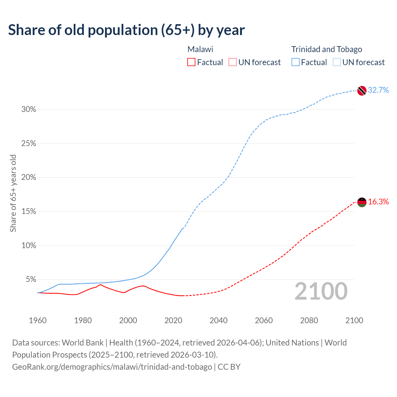 The share of older people aged 65 and over is 2.59% in Malawi and 12.4% in Trinidad and Tobago. Life expectancy in Malawi compared to Trinidad and Tobago .
