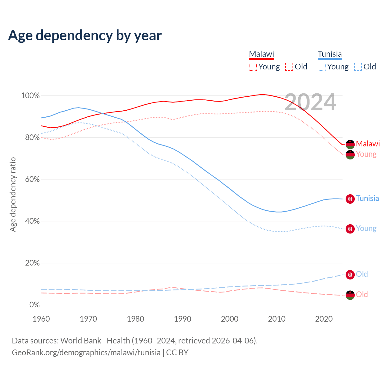 - Malawi is ranked 181/196 by median age (oldest to youngest) vs 86/196 for Tunisia.