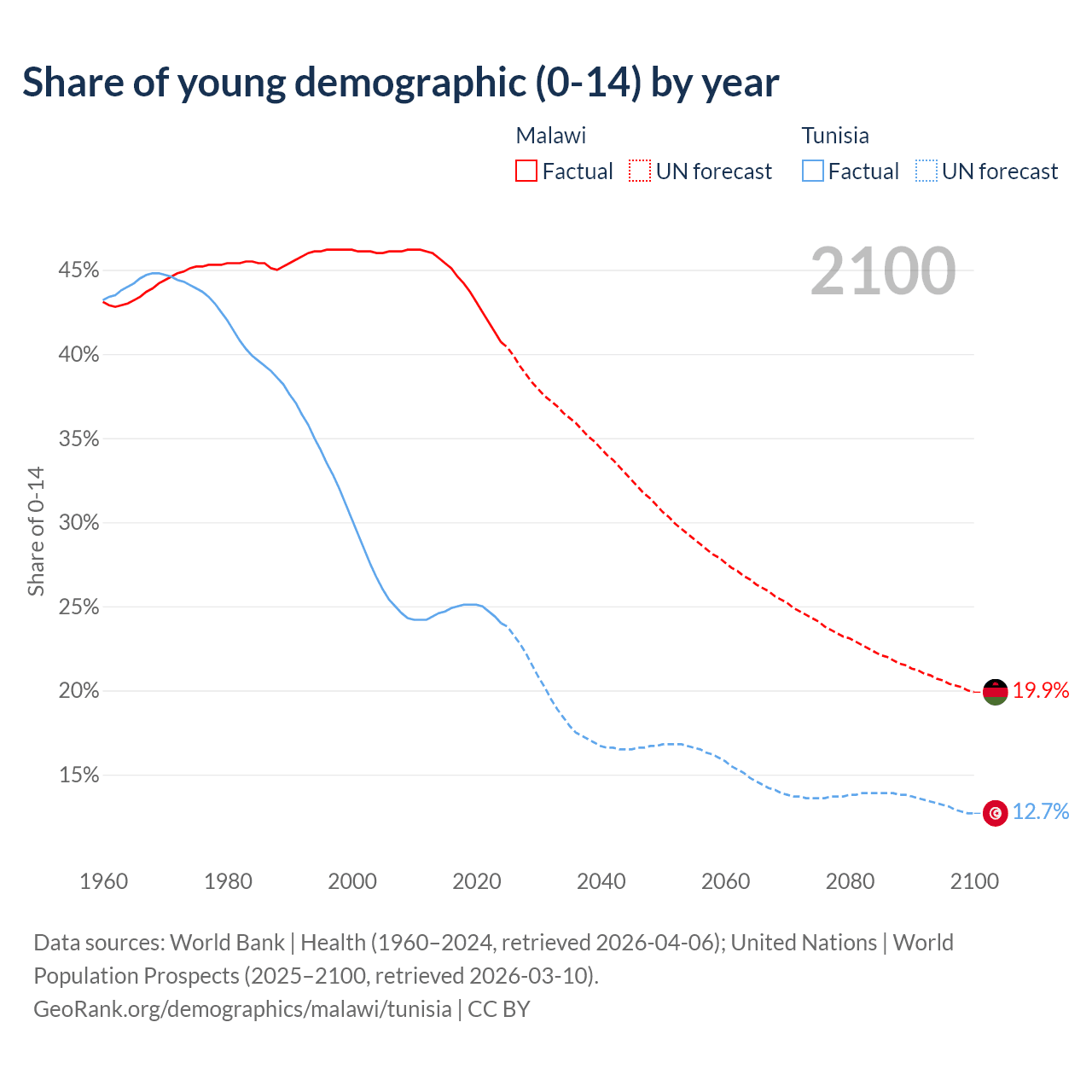 - The share of young demographic (0-15 years old) in Malawi is 40.7% vs 24% in Tunisia.