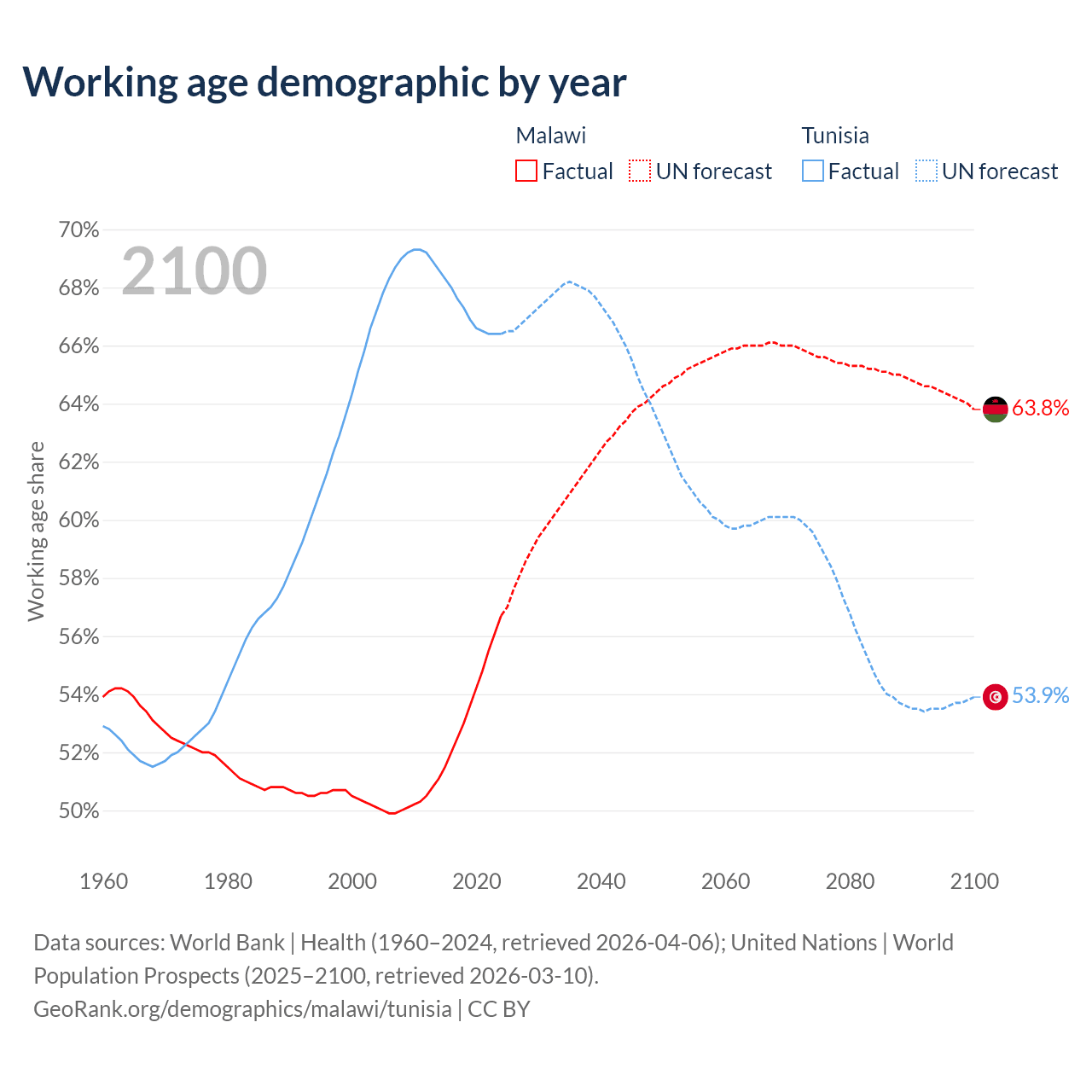 - Malawi has 13M working age adults (aged 15-64) vs 8.26M in Tunisia.
