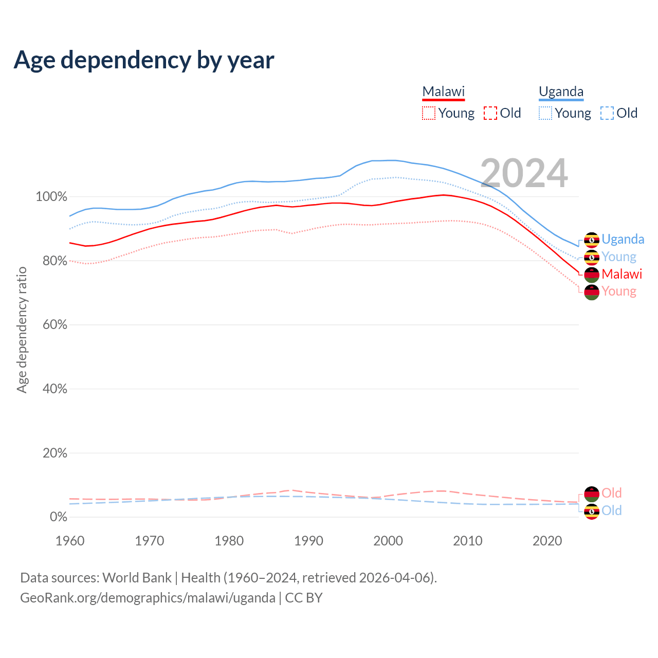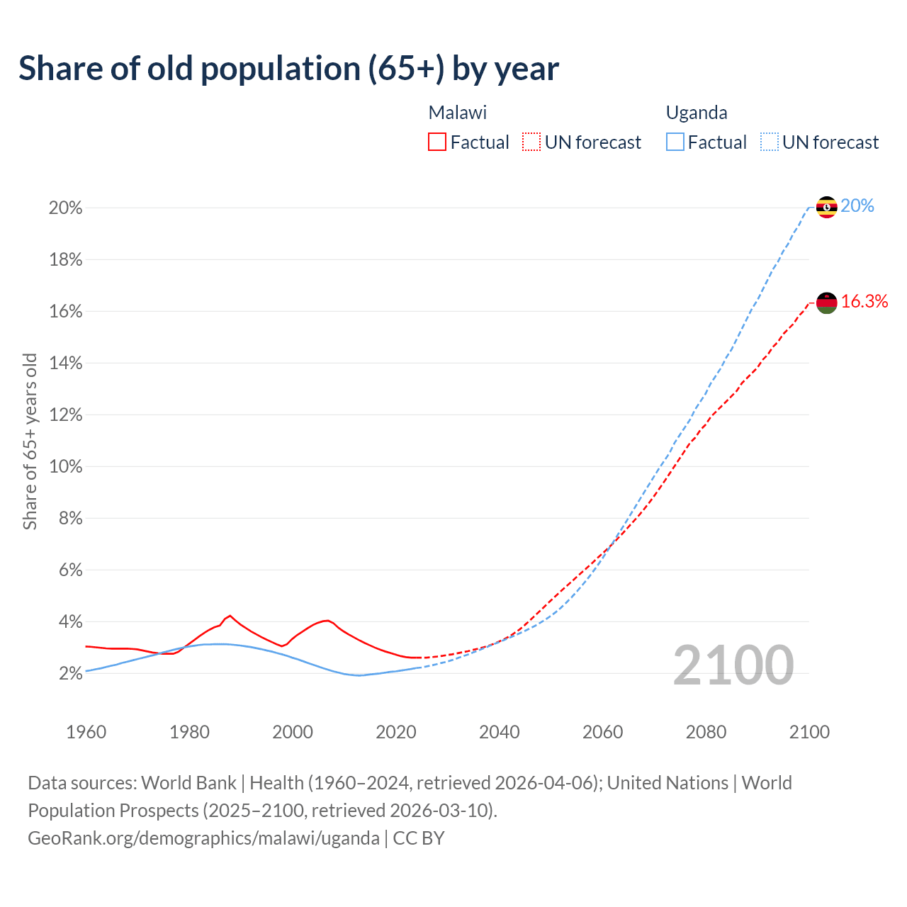 The share of older people aged 65 and over is 2.59% in Malawi and 2.19% in Uganda. Life expectancy in Malawi compared to Uganda .