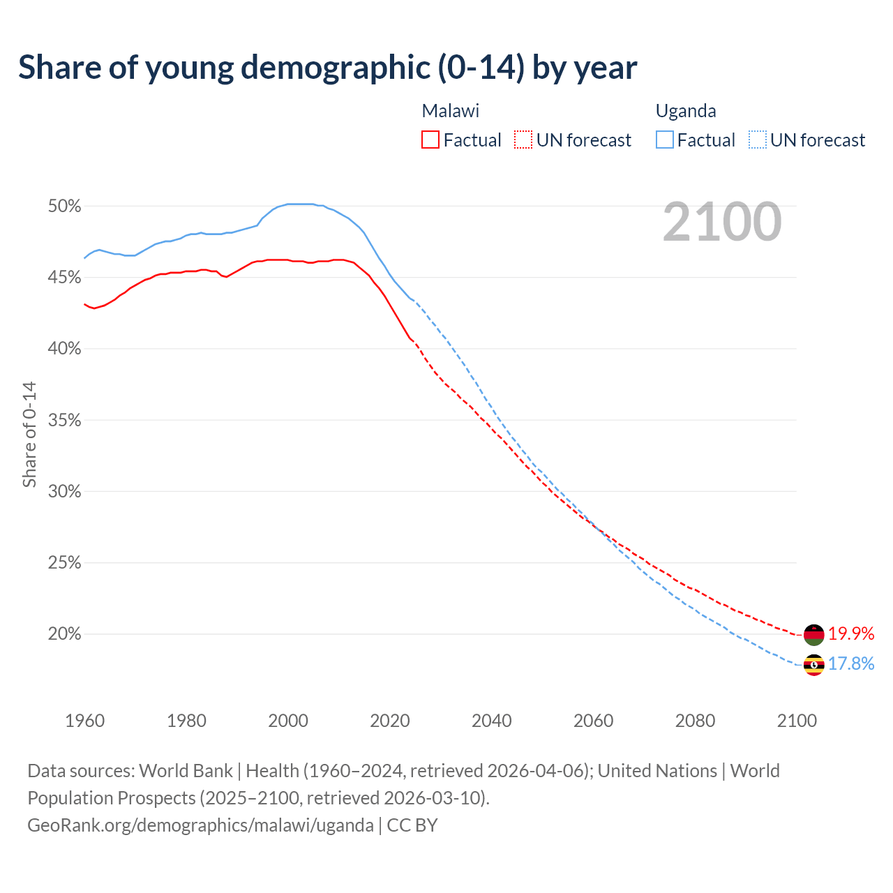 Median age Malawi vs Uganda, 1960-2100