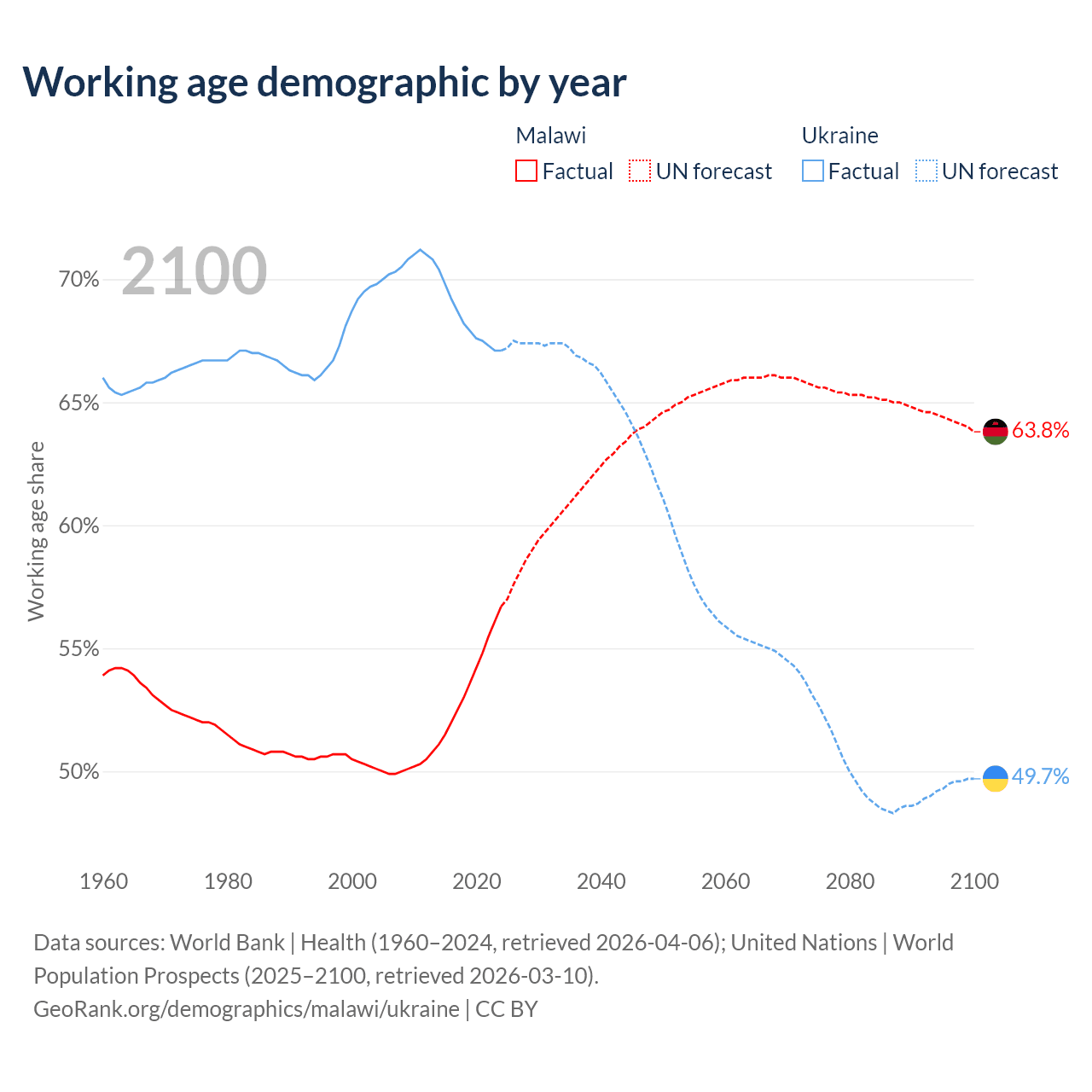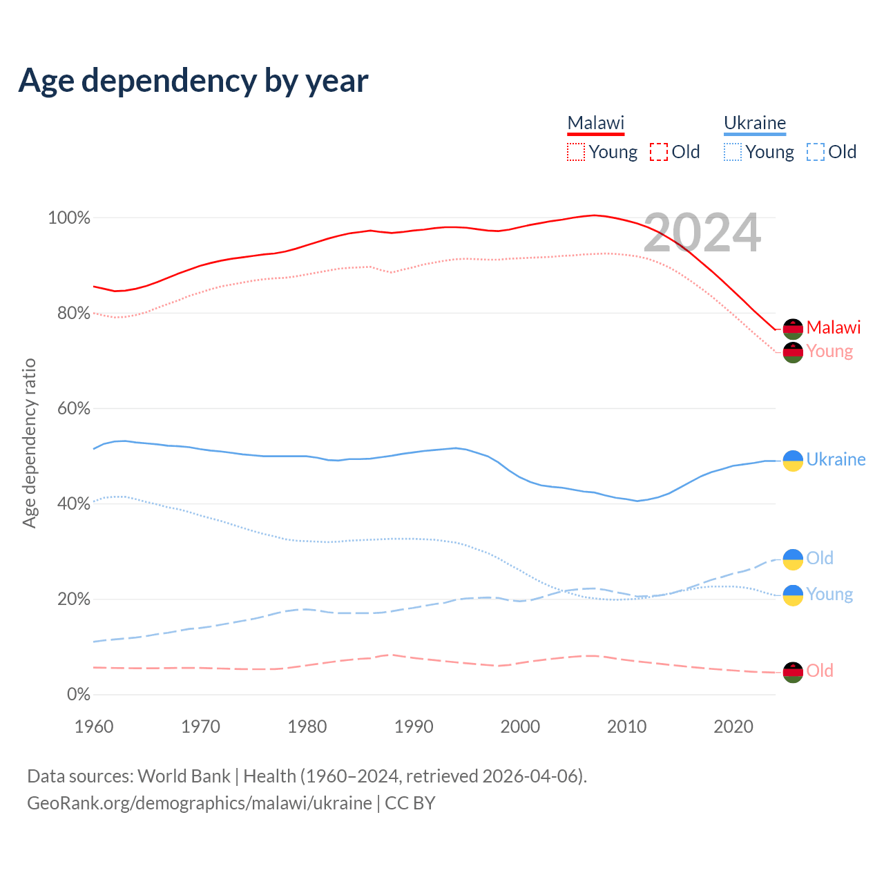 The share of older people aged 65 and over is 2.59% in Malawi and 19% in Ukraine. Life expectancy in Malawi compared to Ukraine .