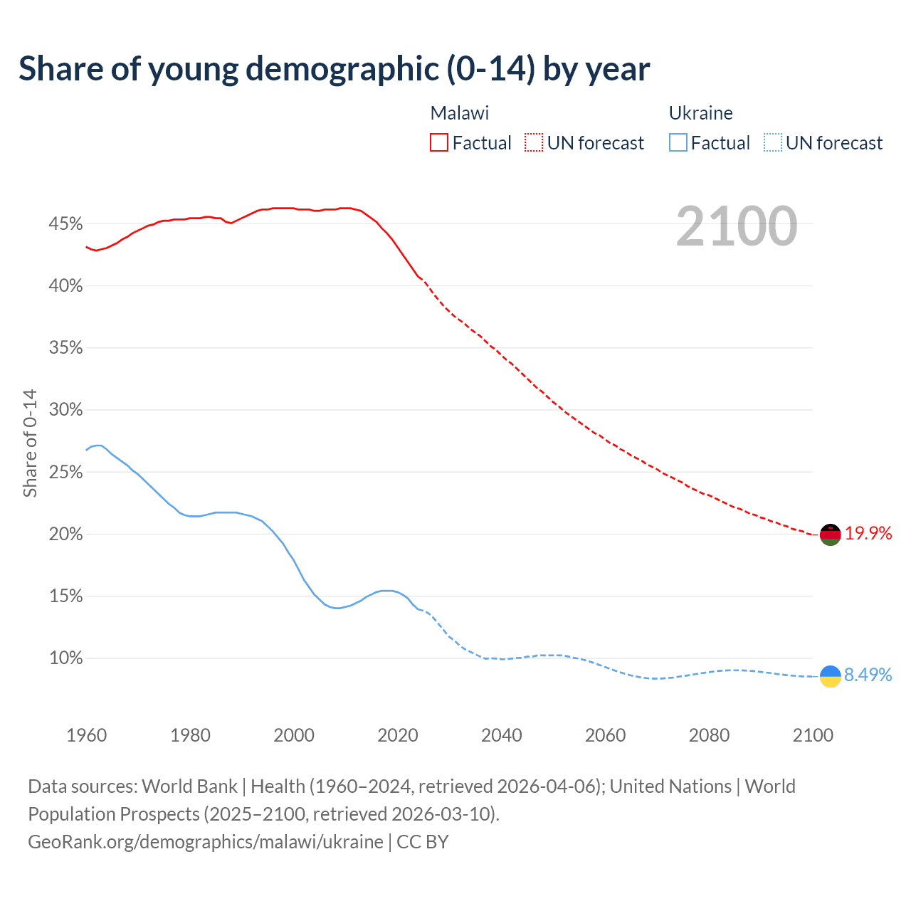 - The share of young demographic (0-15 years old) in Malawi is 40.7% vs 13.9% in Ukraine.