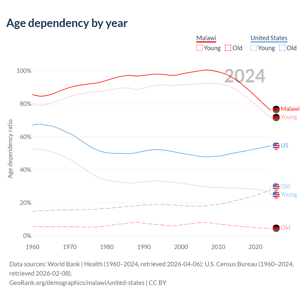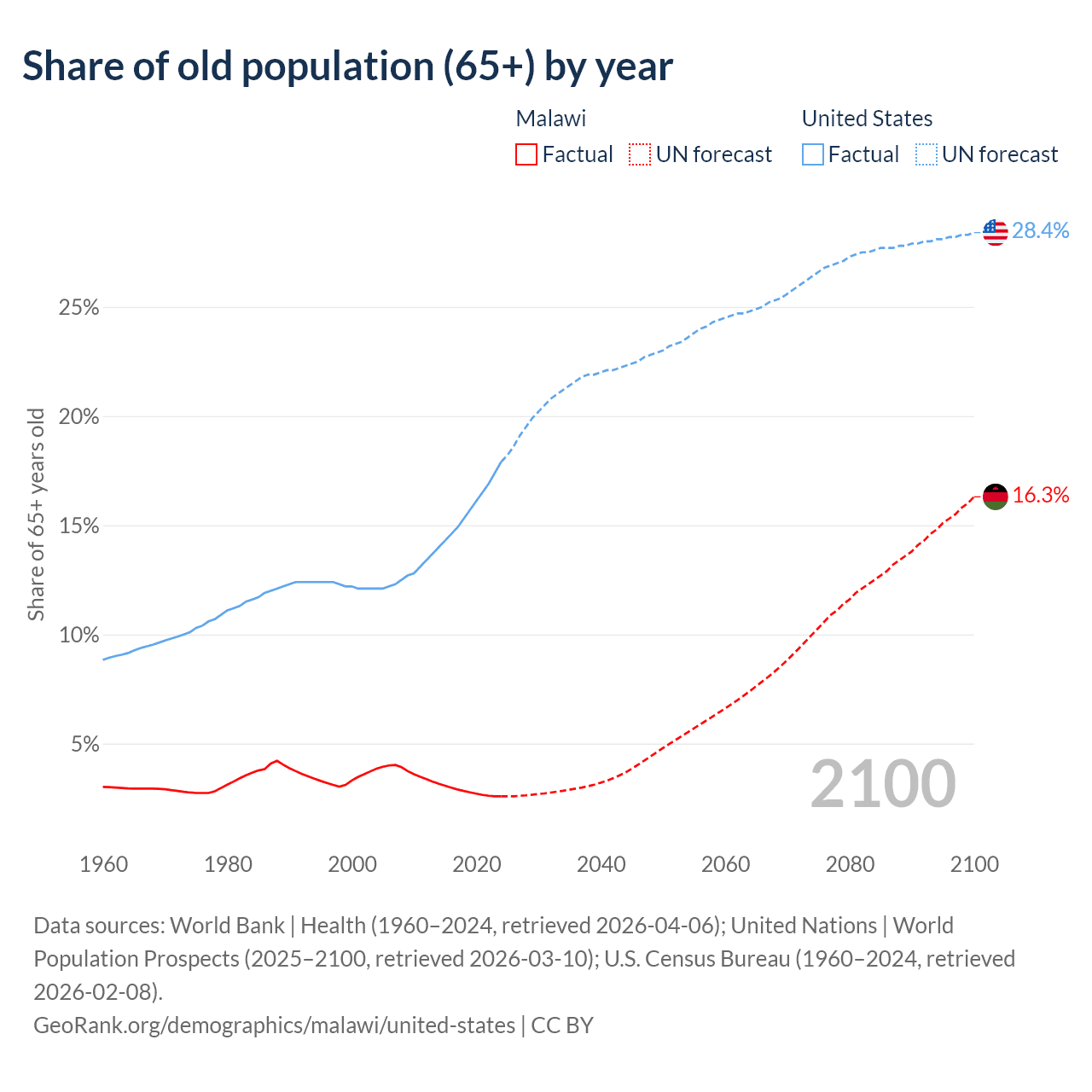 - The share of old-age demographic (65+) in Malawi is 2.59% vs 17.9% in the United States.