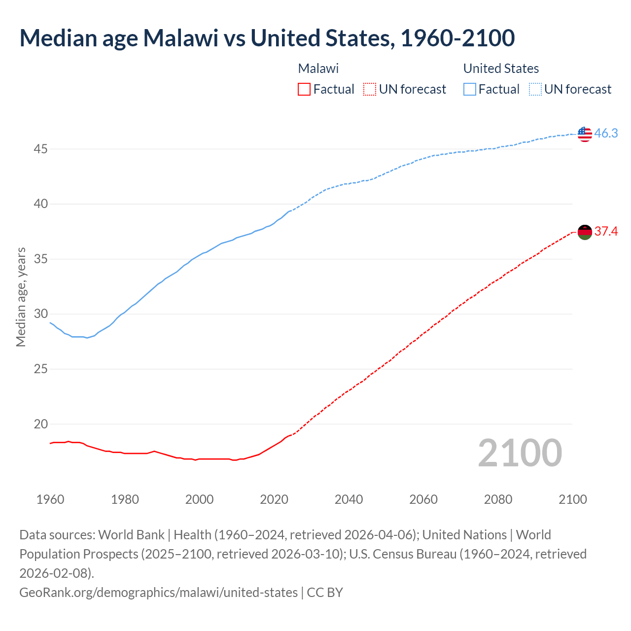 - Malawi is ranked 181/196 by median age (oldest to youngest) vs 50/196 for the United States.
