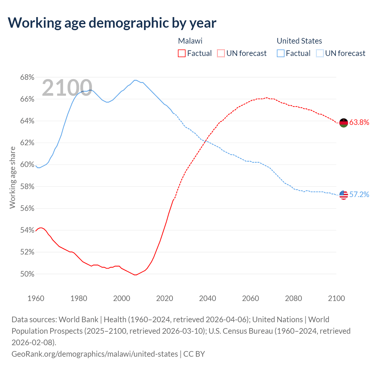 - Malawi has 13M working age adults (aged 15-64) vs 223M in the United States.
