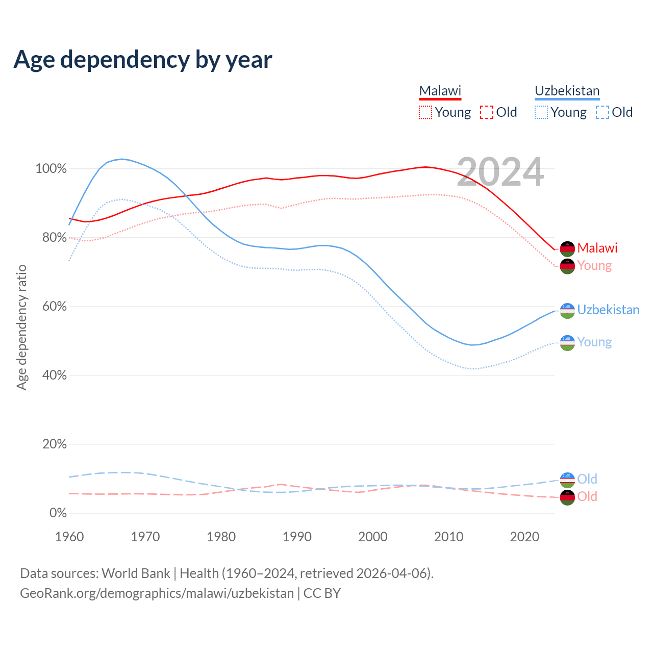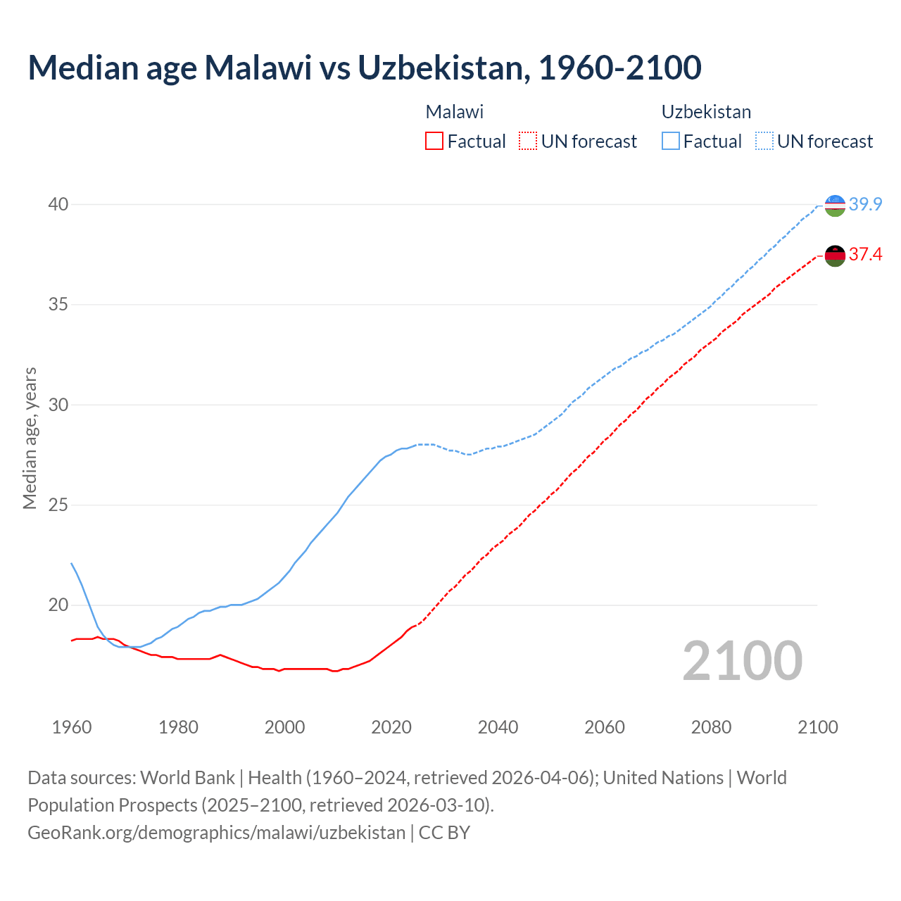 - Malawi is ranked 181/196 by median age (oldest to youngest) vs 116/196 for Uzbekistan.