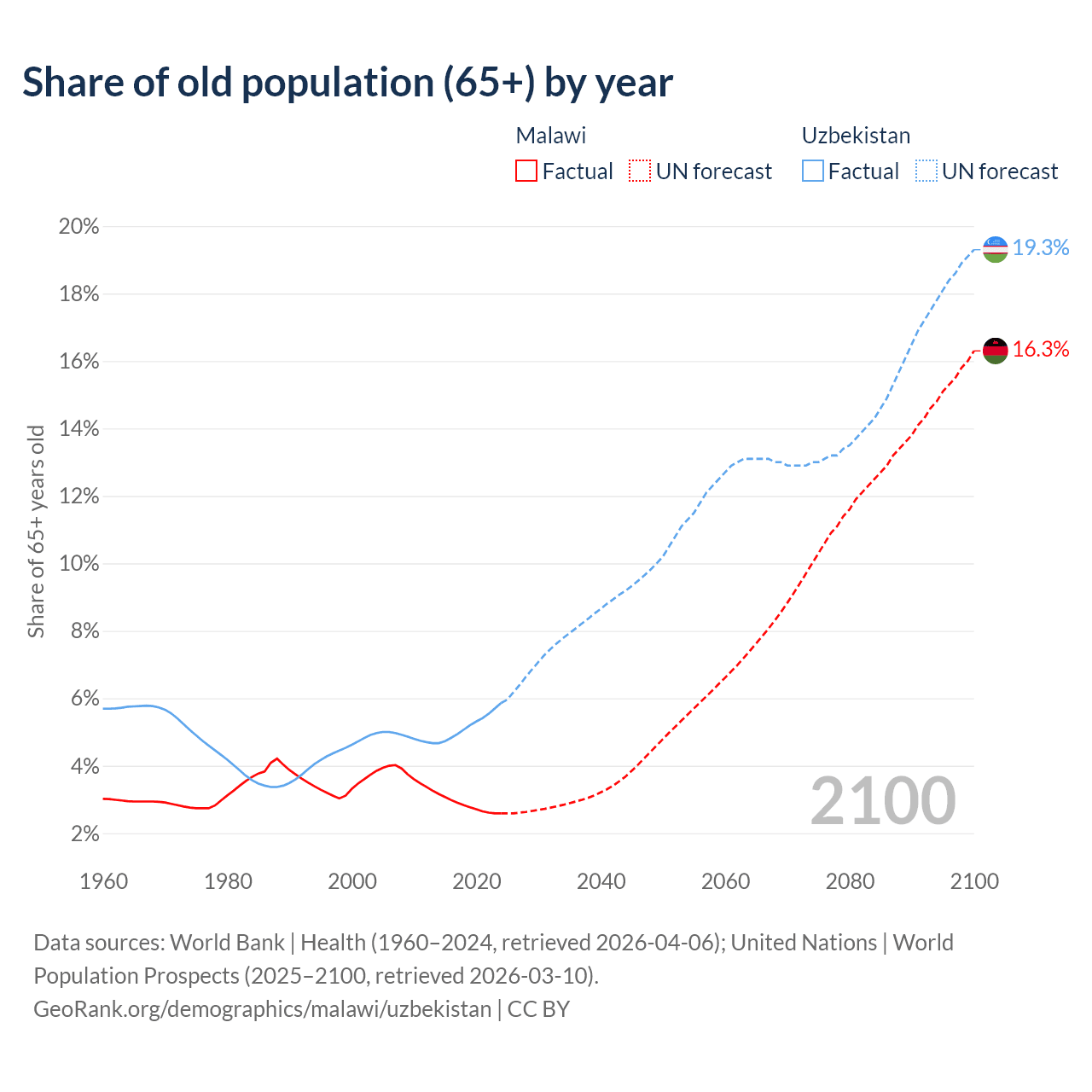 The share of older people aged 65 and over is 2.59% in Malawi and 5.86% in Uzbekistan. Life expectancy in Malawi compared to Uzbekistan .
