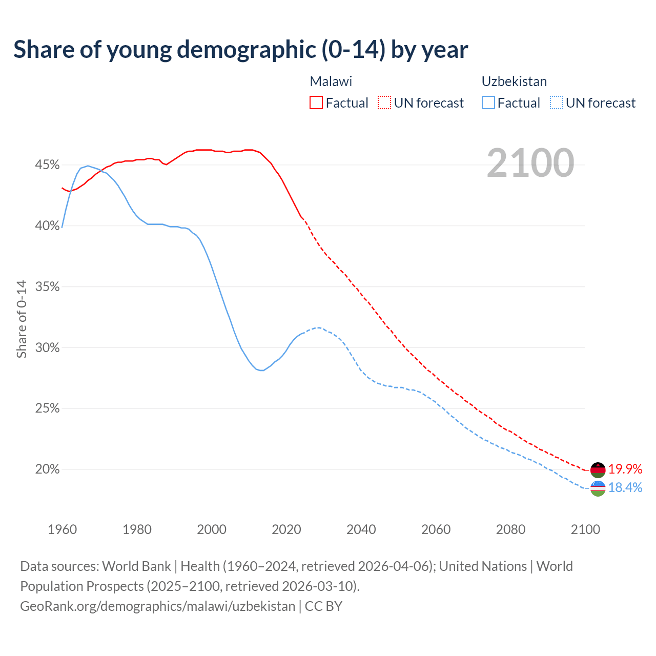 - The share of young demographic (0-15 years old) in Malawi is 40.7% vs 31.1% in Uzbekistan.