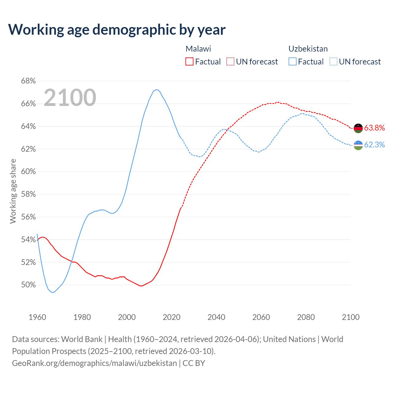 - Malawi has 13M working age adults (aged 15-64) vs 23.9M in Uzbekistan.