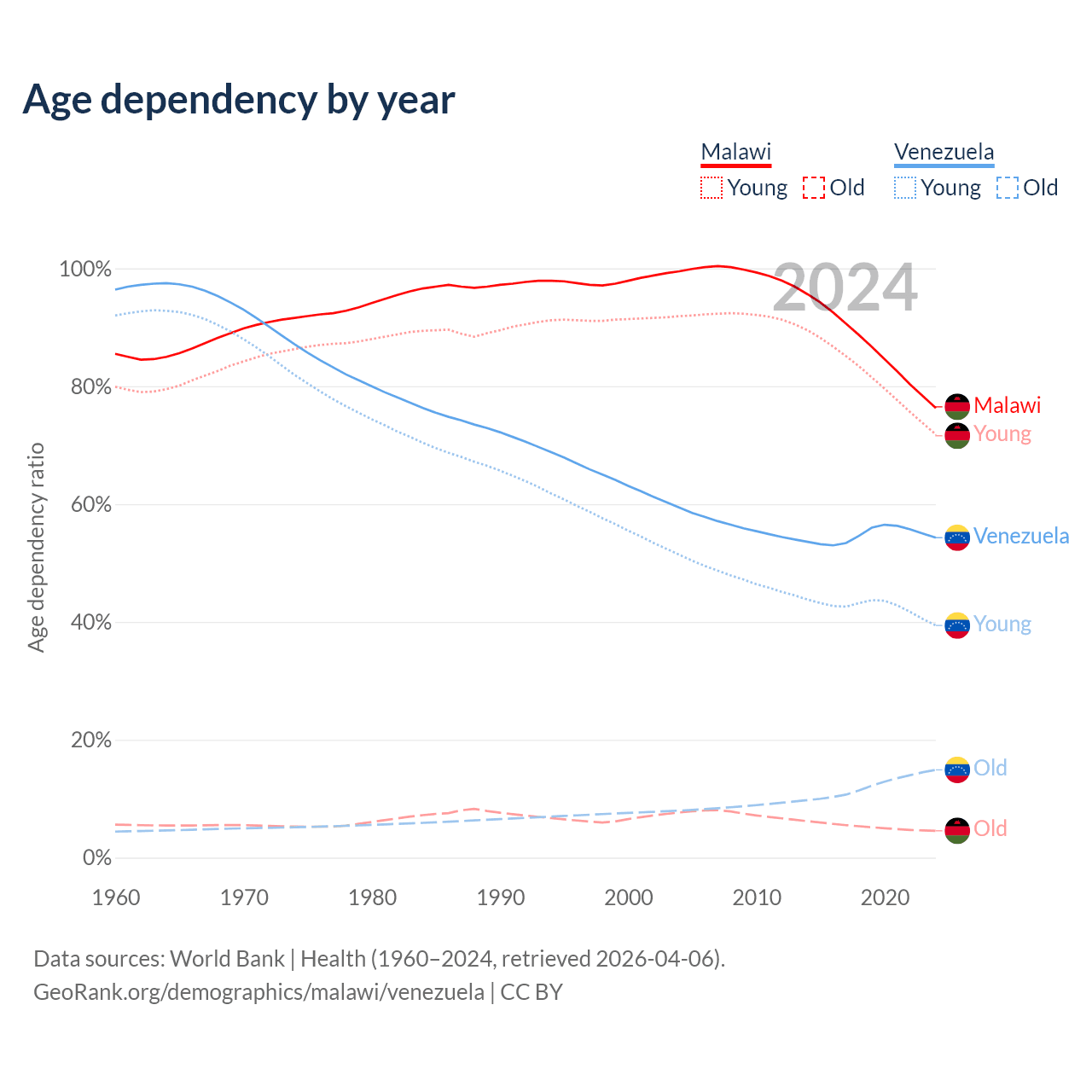 - Malawi is ranked 181/196 by median age (oldest to youngest) vs 104/196 for Venezuela.