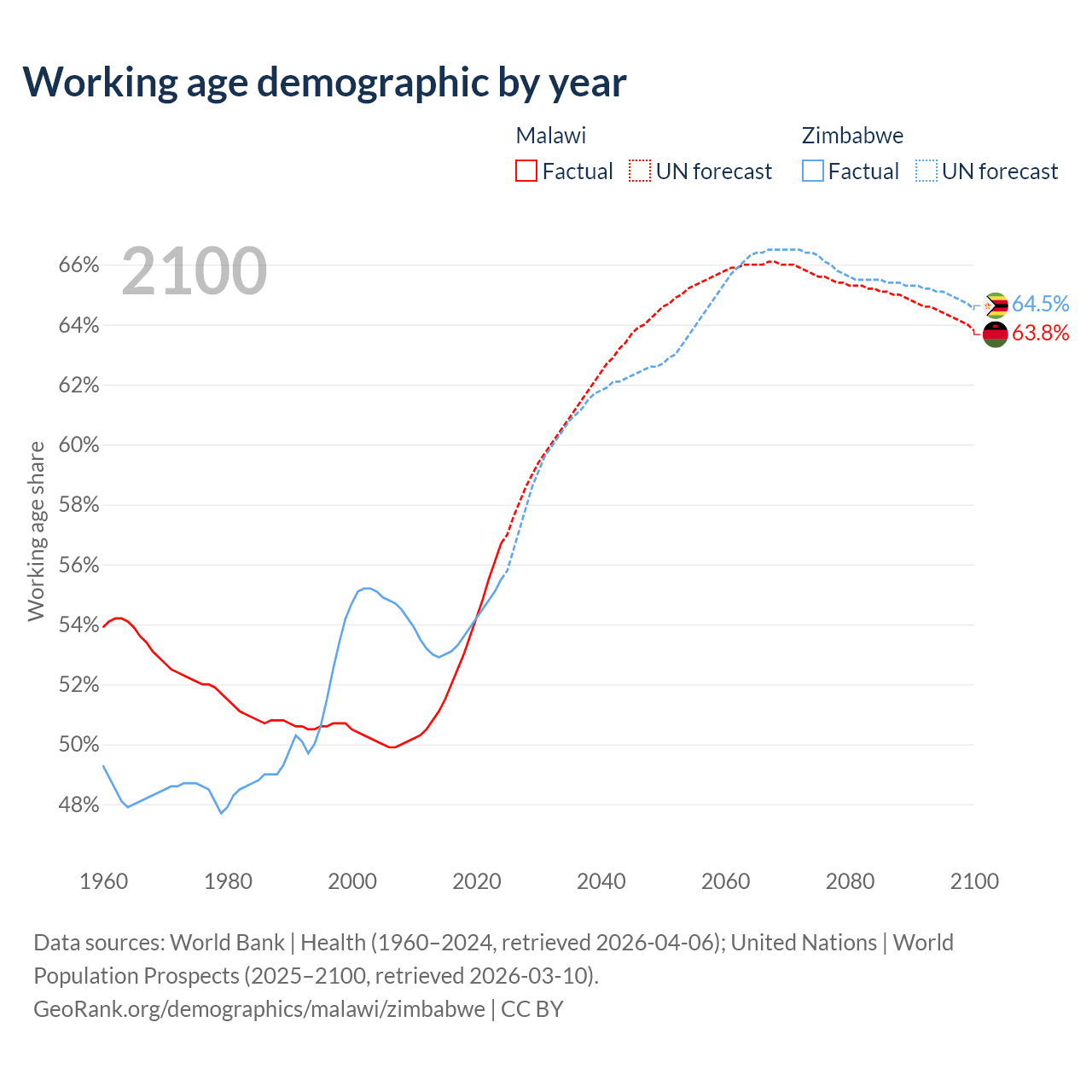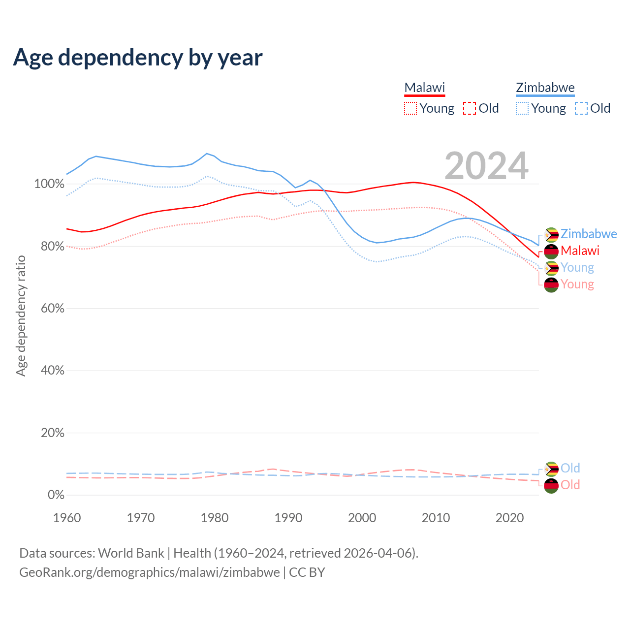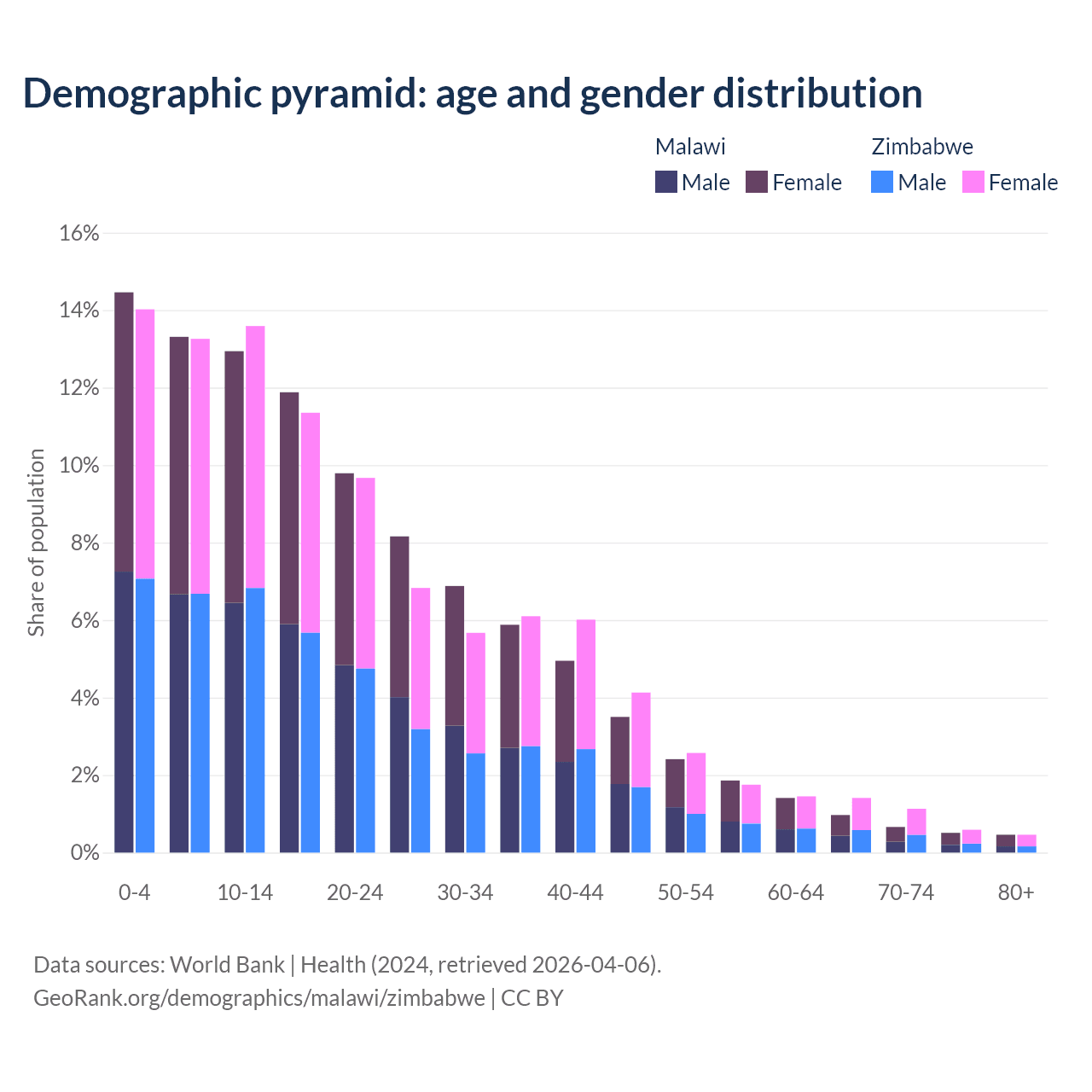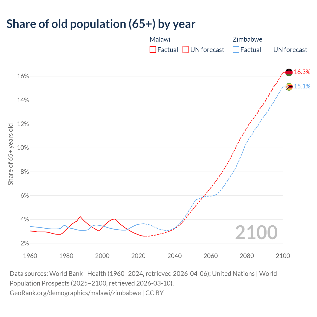 The share of older people aged 65 and over is 2.59% in Malawi and 3.6% in Zimbabwe. Life expectancy in Malawi compared to Zimbabwe .
