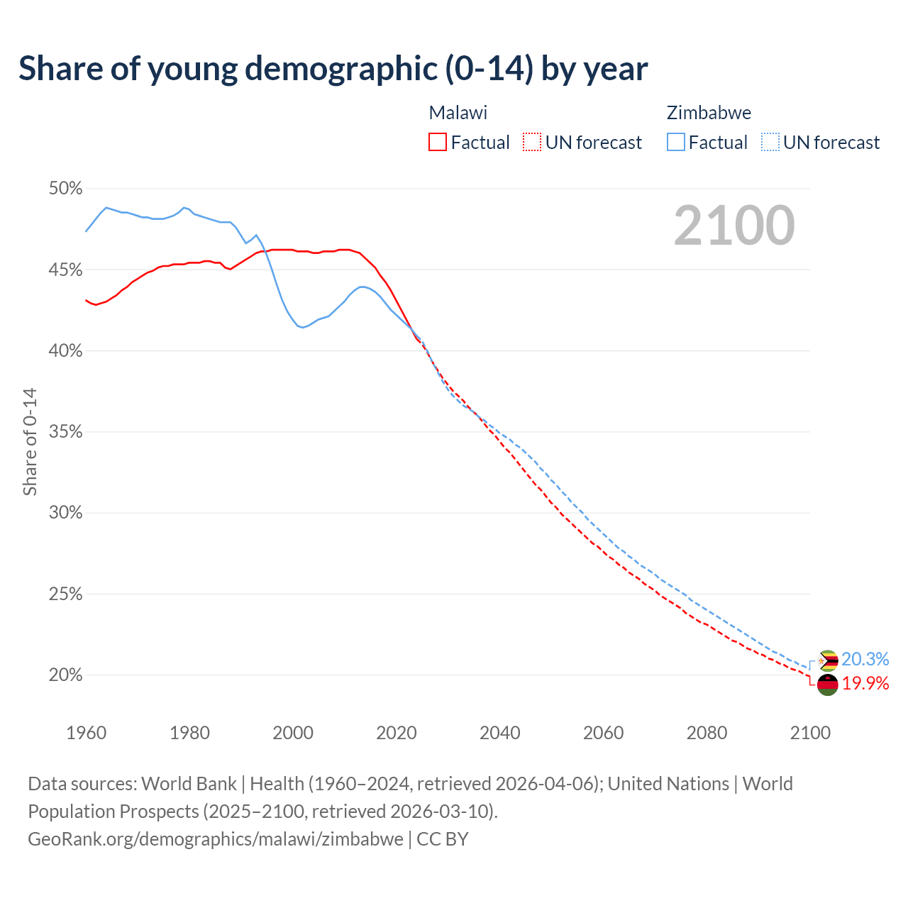 - The share of young demographic (0-15 years old) in Malawi is 40.7% vs 40.9% in Zimbabwe.