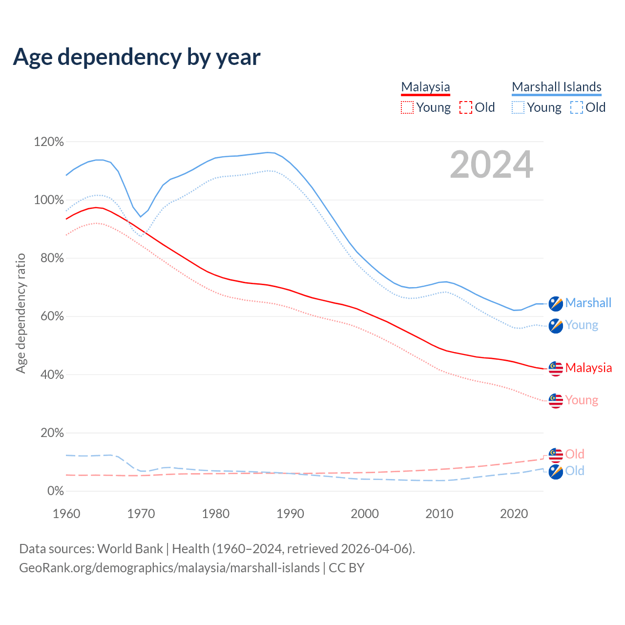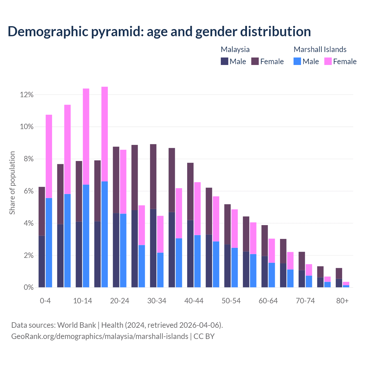 - Malaysia is ranked 92/196 by median age (oldest to youngest) vs 150/196 for the Marshall Islands.