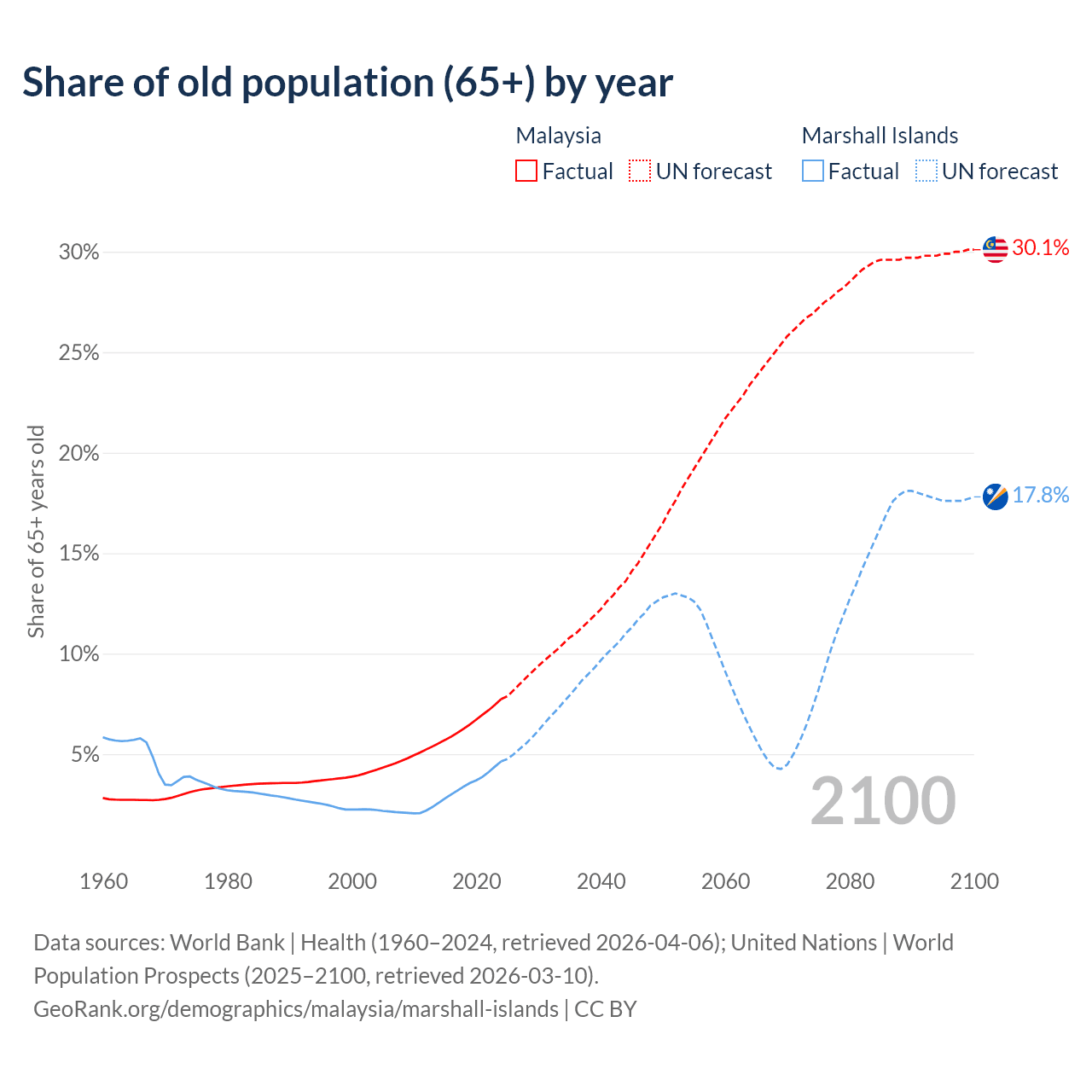 - The share of old-age demographic (65+) in Malaysia is 7.74% vs 4.64% in the Marshall Islands.