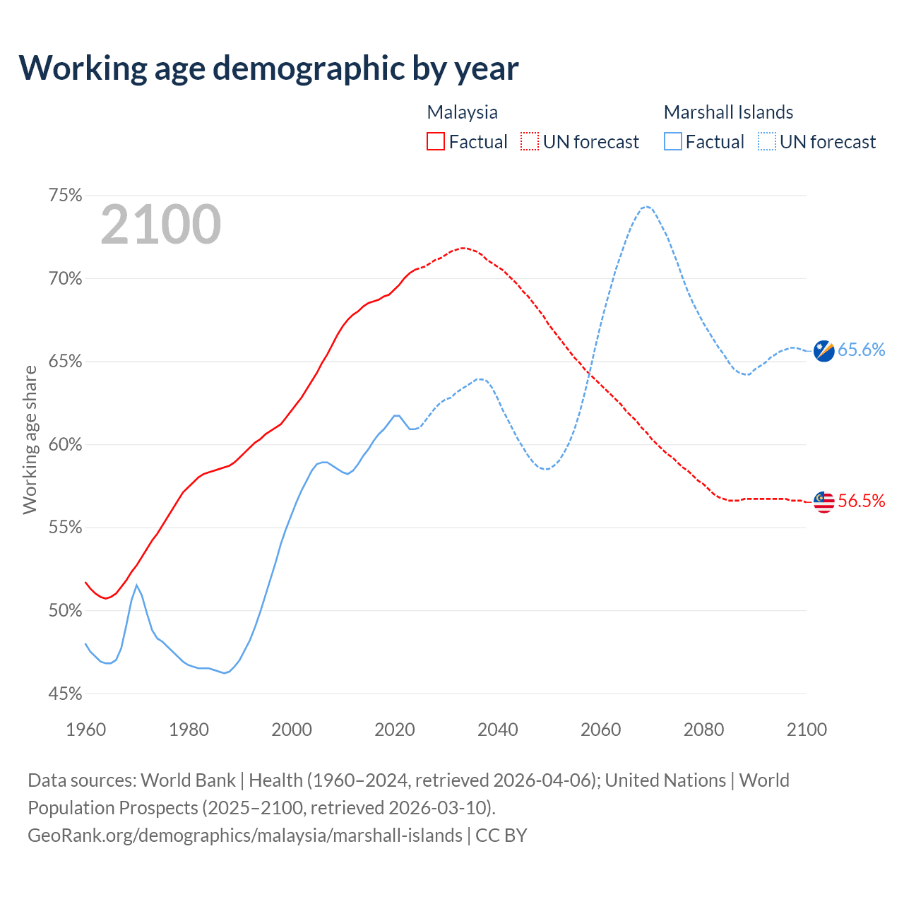 - Malaysia has 25.7M working age adults (aged 15-64) vs 21.3K in the Marshall Islands.