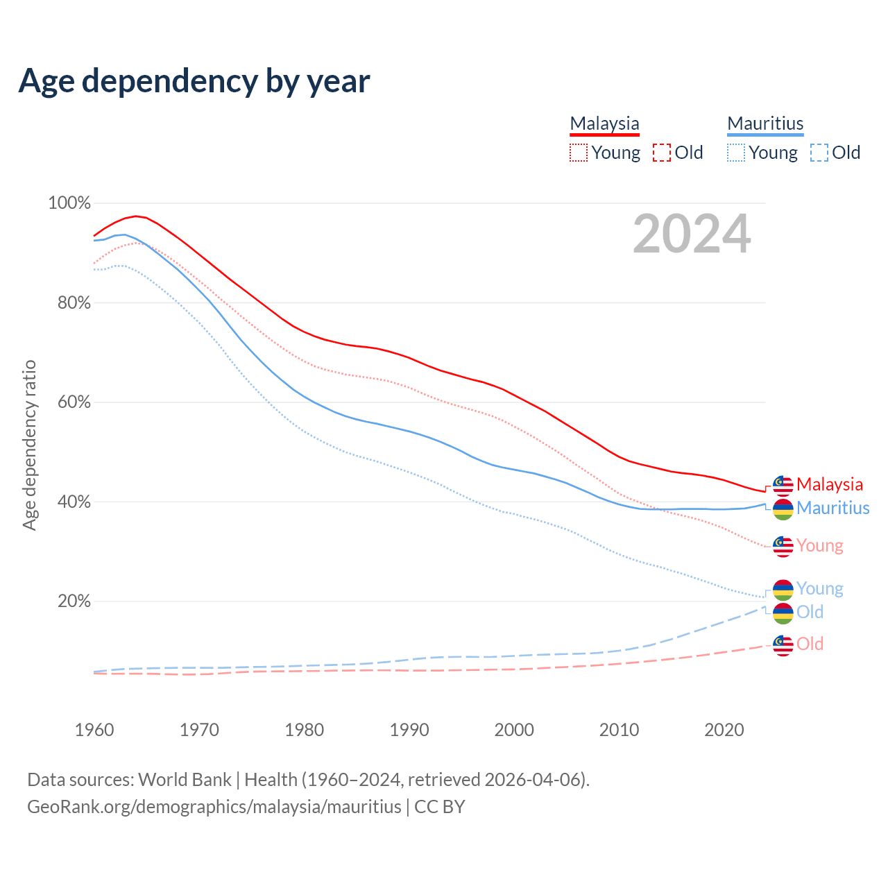 - Malaysia is ranked 92/196 by median age (oldest to youngest) vs 57/196 for Mauritius.