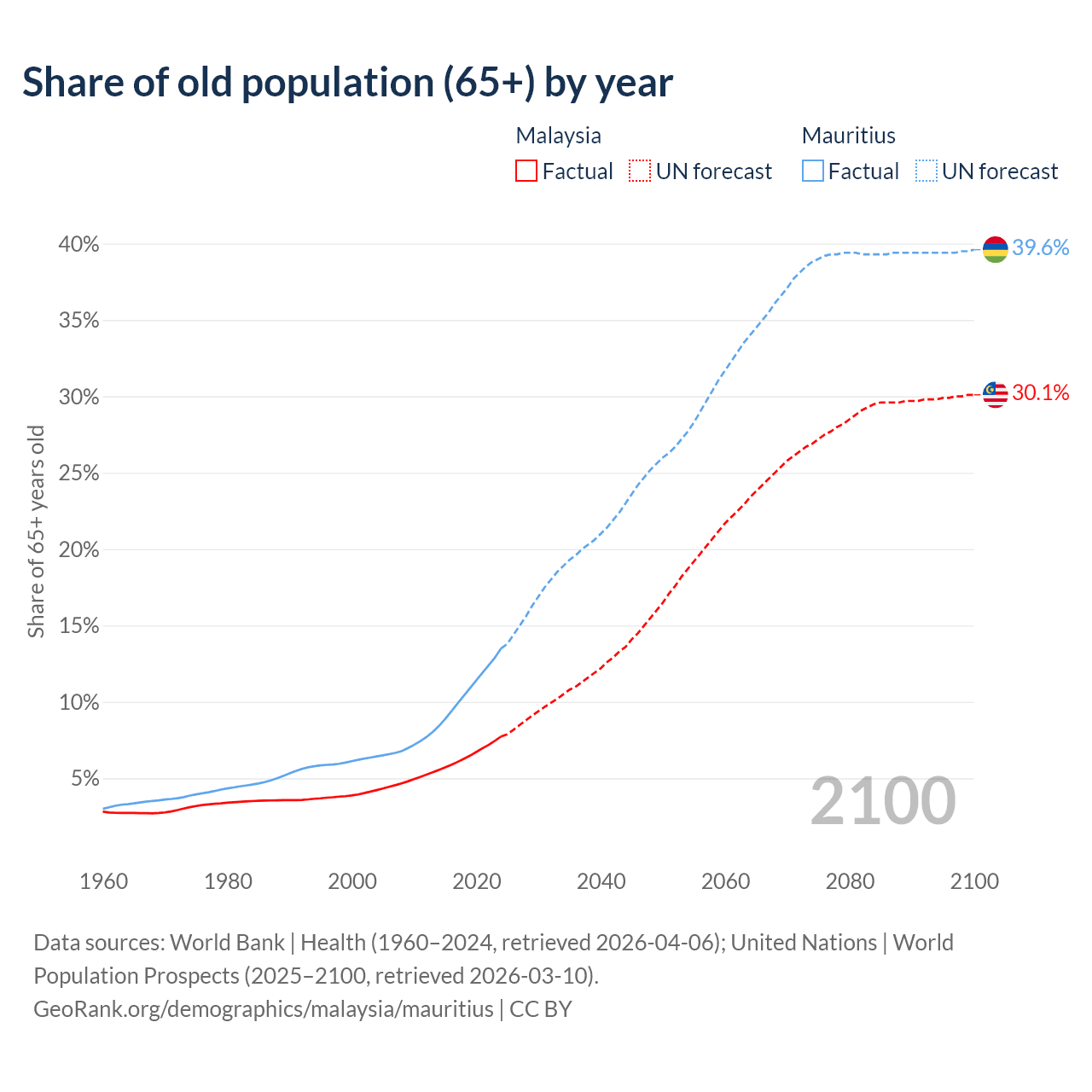 The share of older people aged 65 and over is 7.74% in Malaysia and 13.5% in Mauritius. Life expectancy in Malaysia compared to Mauritius .