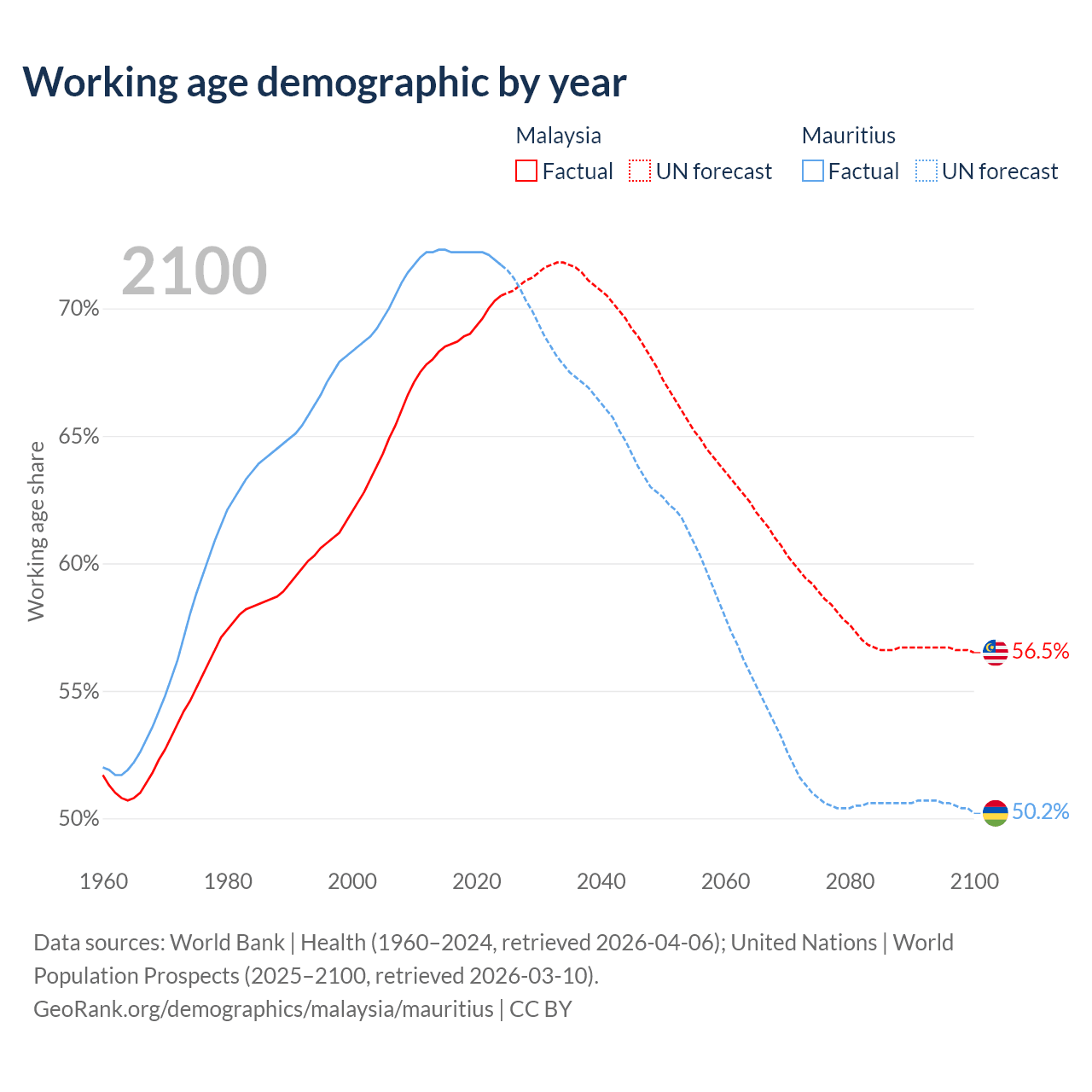 - Malaysia has 25.7M working age adults (aged 15-64) vs 889K in Mauritius.
