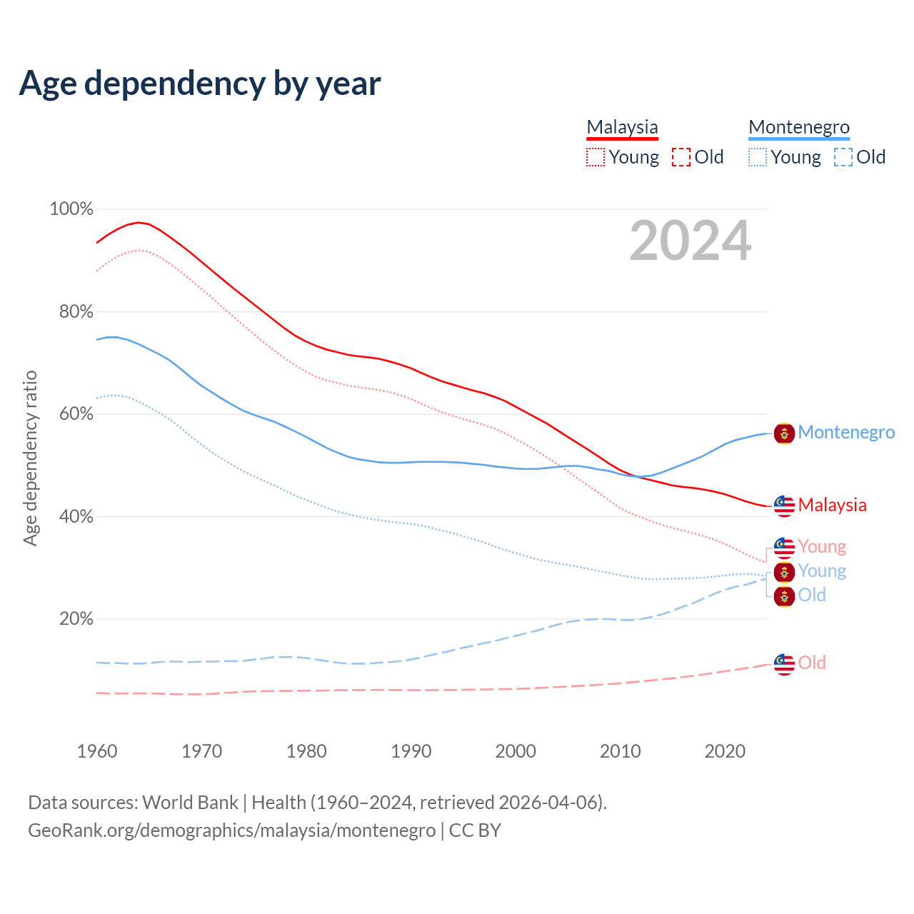 - Malaysia is ranked 92/196 by median age (oldest to youngest) vs 45/196 for Montenegro.