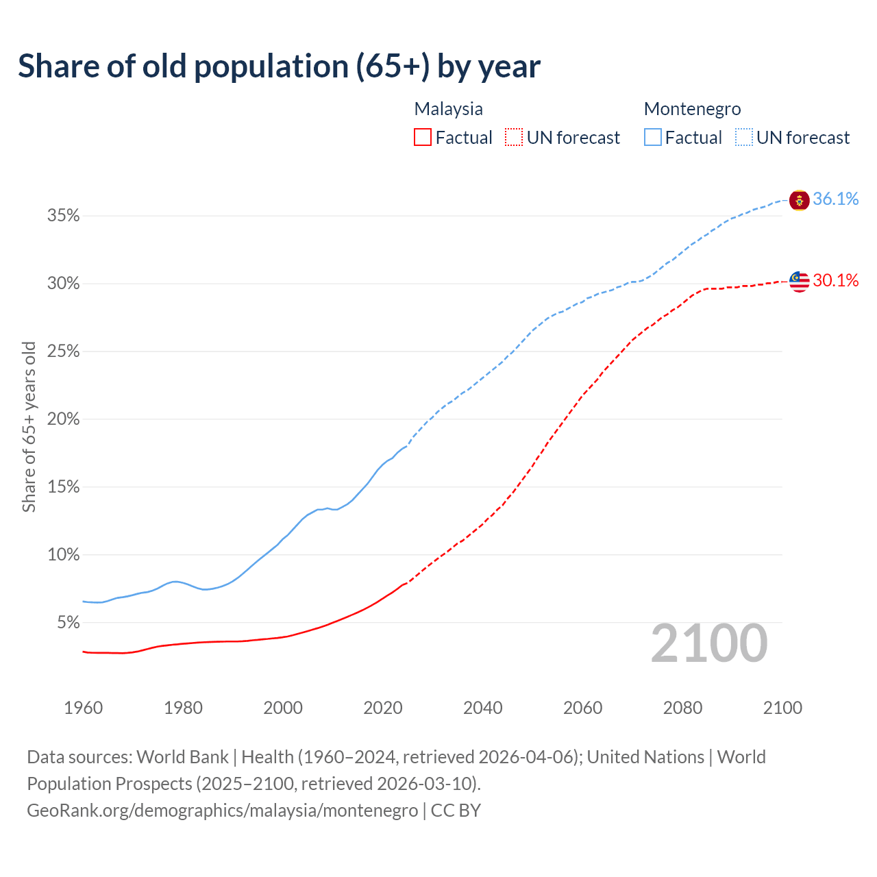 The share of older people aged 65 and over is 7.74% in Malaysia and 17.8% in Montenegro. Life expectancy in Malaysia compared to Montenegro .