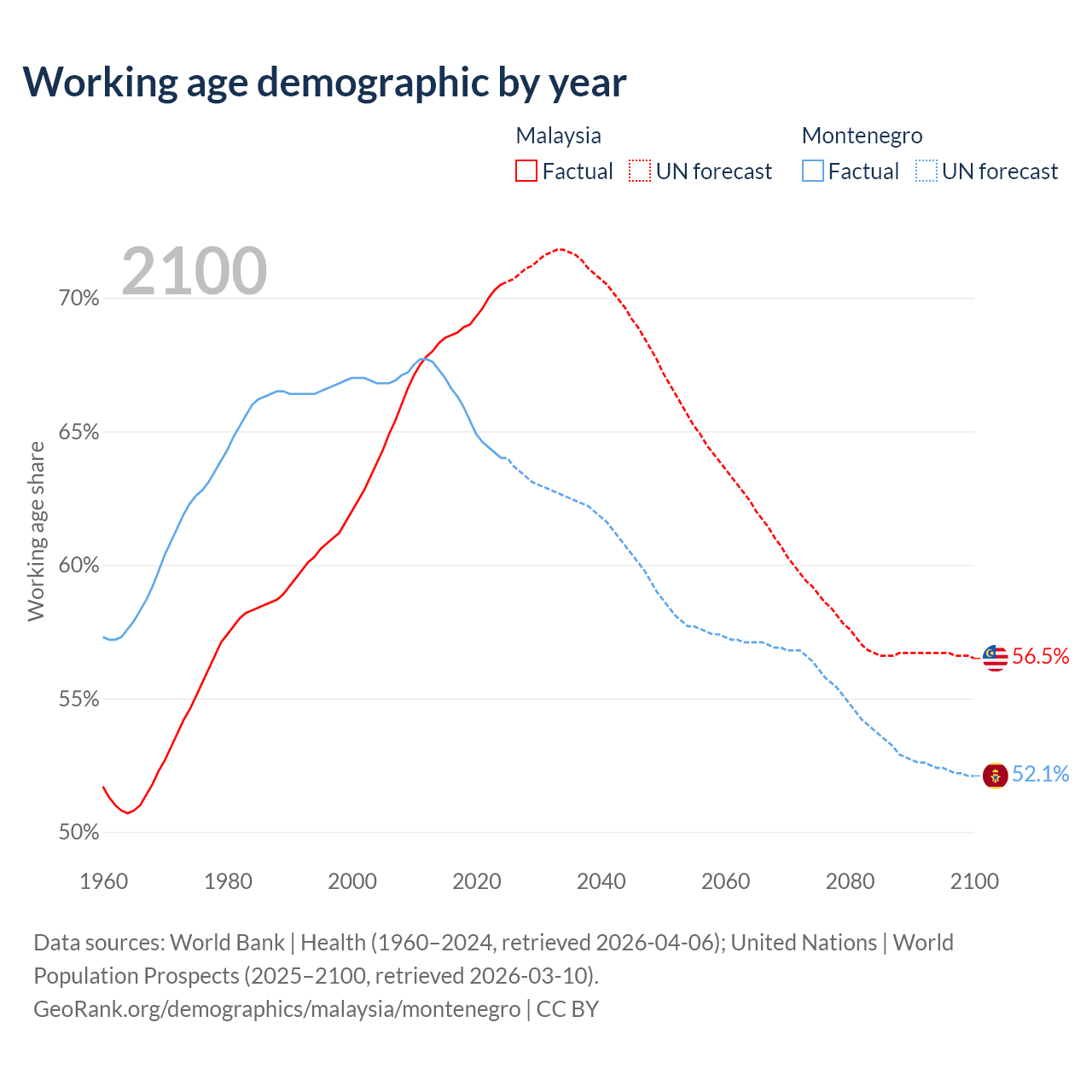 - Malaysia has 25.7M working age adults (aged 15-64) vs 392K in Montenegro.