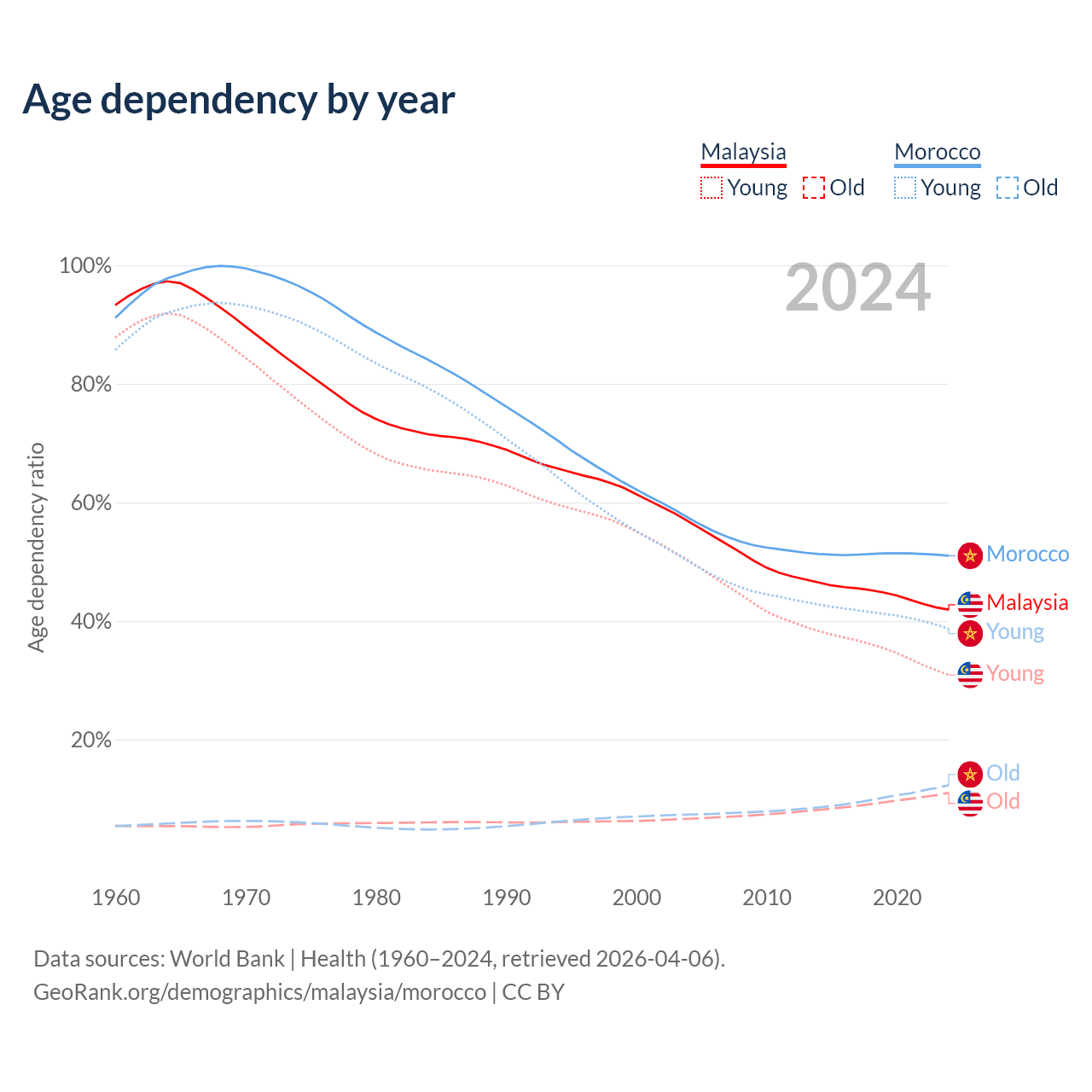 - Malaysia is ranked 92/196 by median age (oldest to youngest) vs 100/196 for Morocco.