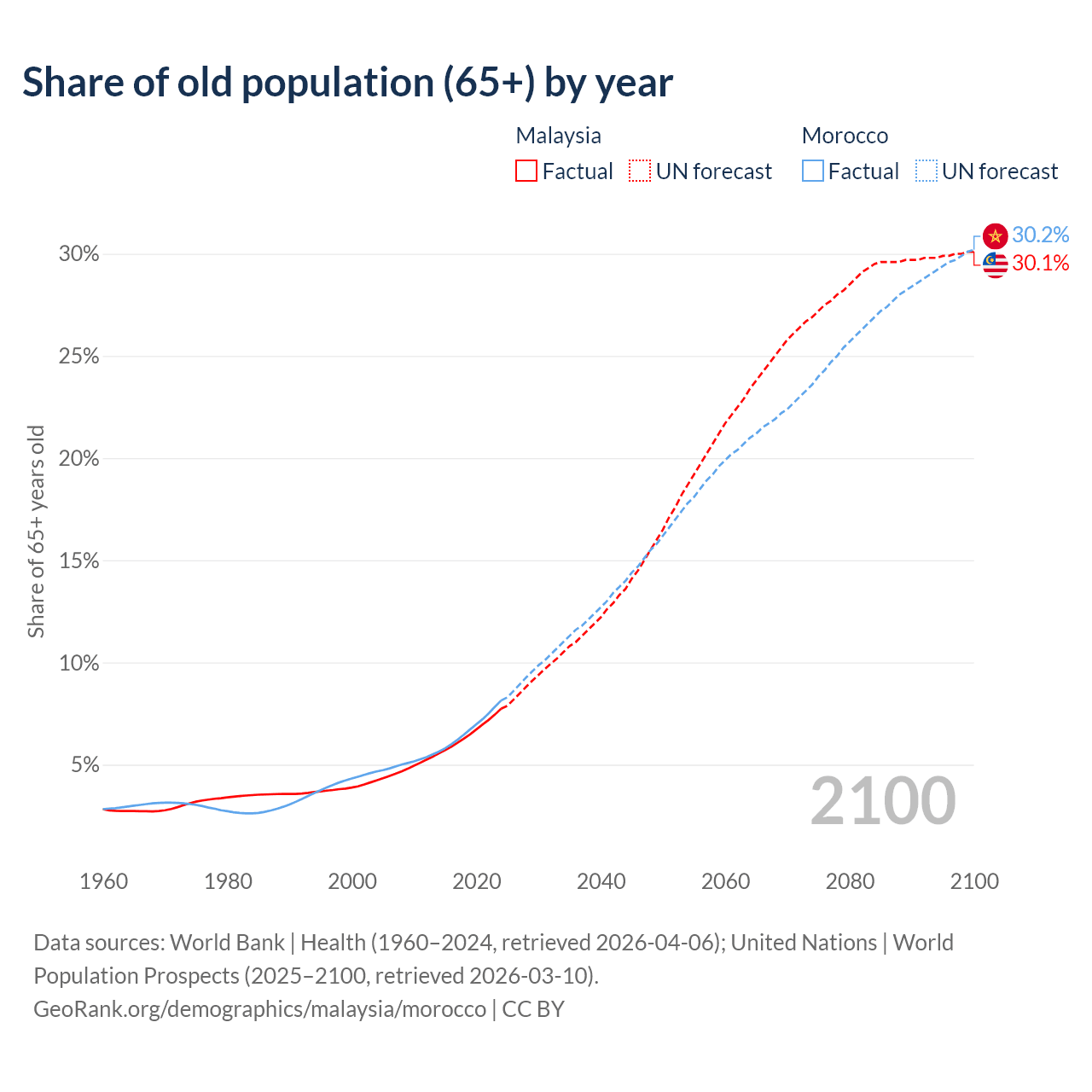 The share of older people aged 65 and over is 7.74% in Malaysia and 8.14% in Morocco. Life expectancy in Malaysia compared to Morocco .