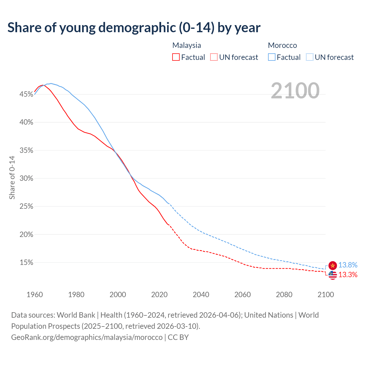 - The share of young demographic (0-15 years old) in Malaysia is 21.8% vs 25.6% in Morocco.