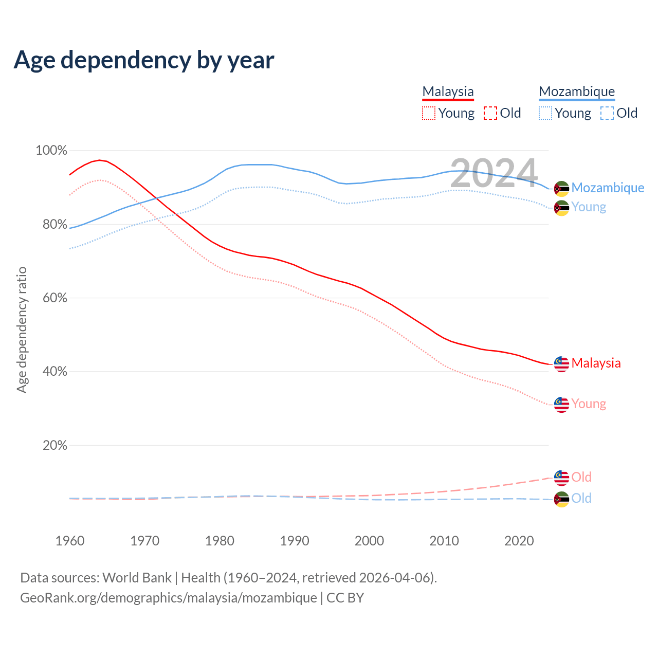 - Malaysia is ranked 92/196 by median age (oldest to youngest) vs 189/196 for Mozambique.