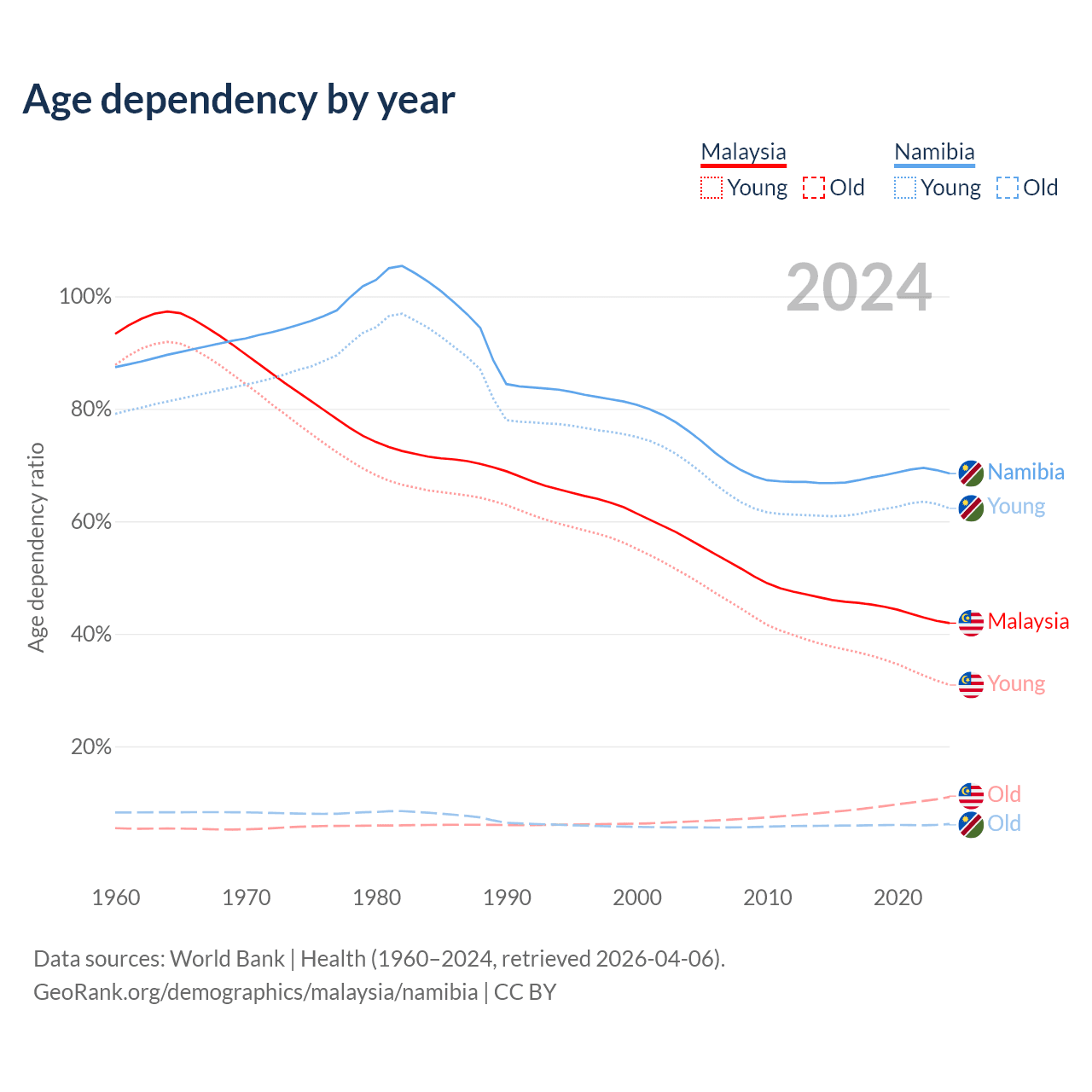 - Malaysia is ranked 92/196 by median age (oldest to youngest) vs 147/196 for Namibia.