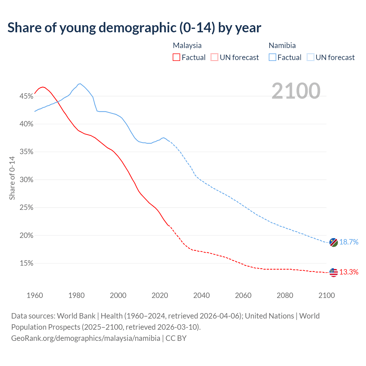 - As of 2026, the population of Malaysia is 36.5M vs 3.17M in Namibia - 11.5 times difference.