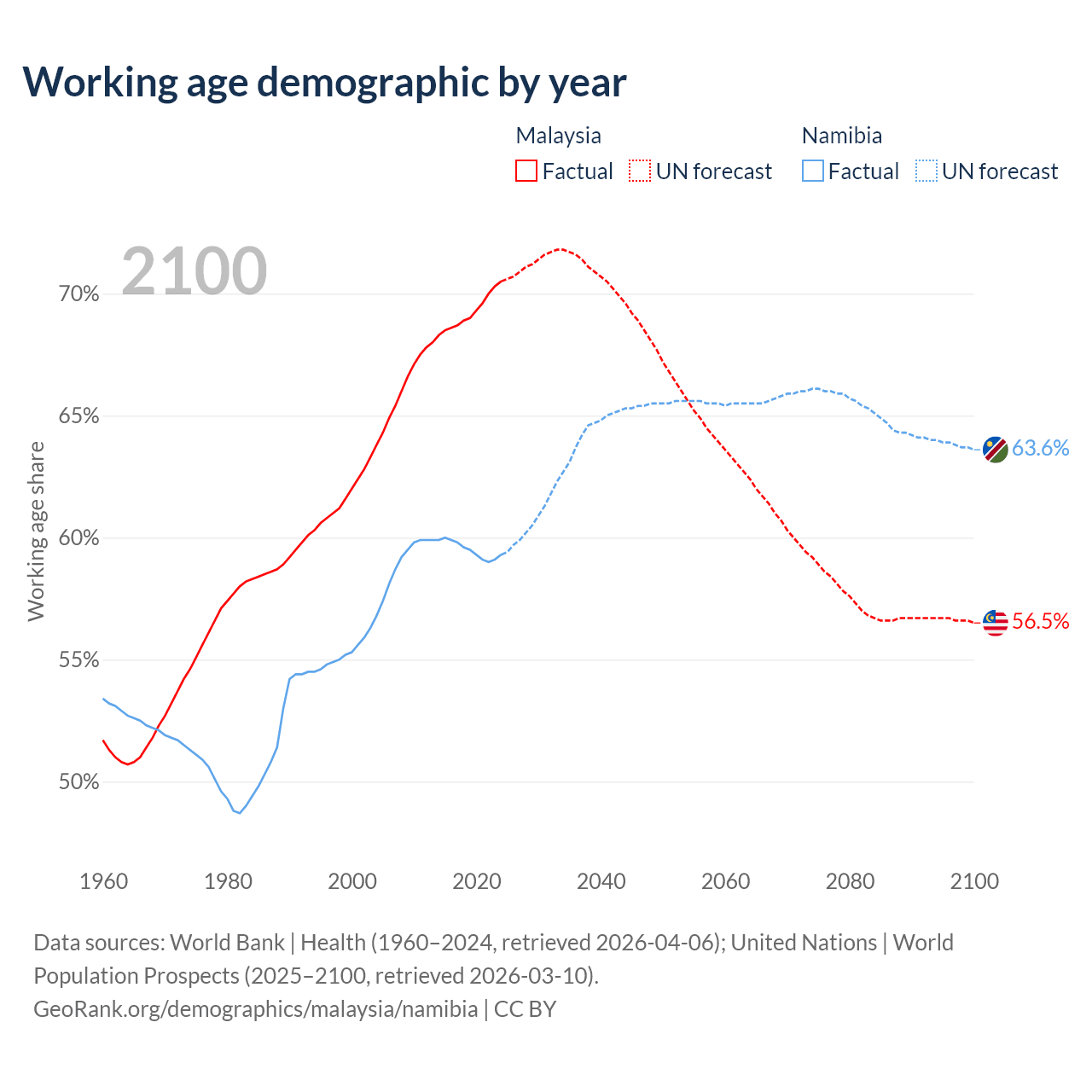 - Malaysia has 25.7M working age adults (aged 15-64) vs 1.88M in Namibia.