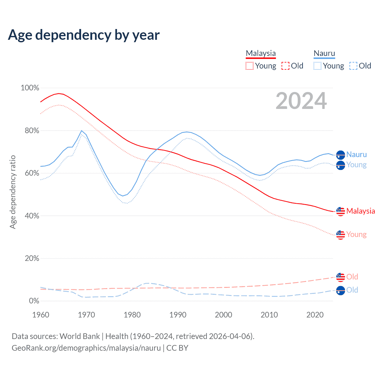 Data sources: World Bank | Health (1960–2024, retrieved 2026-04-06); U.S. Census Bureau (1960–2024, retrieved 2026-02-08).