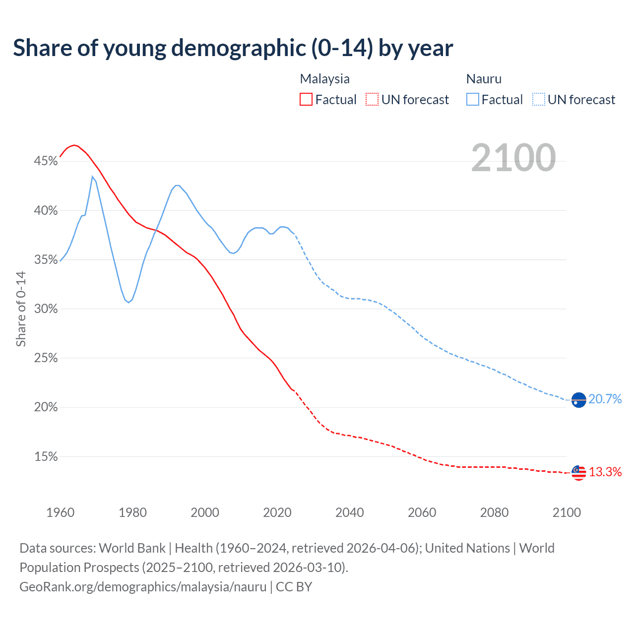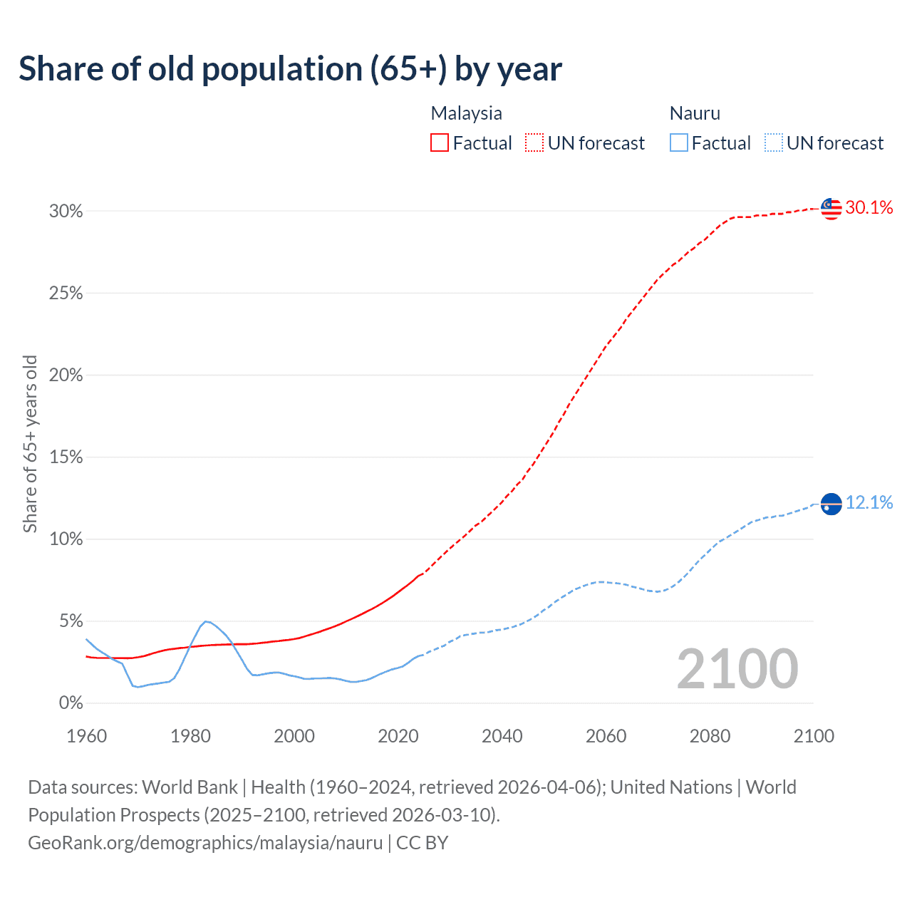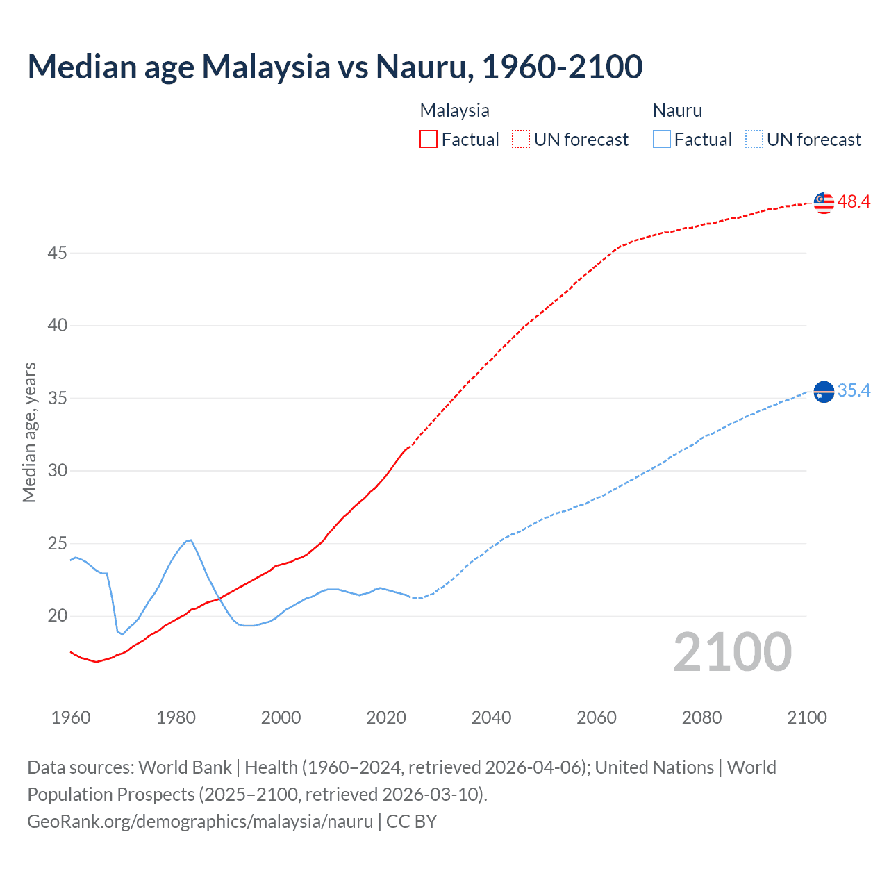 Median age Malaysia vs Nauru, 1960-2100