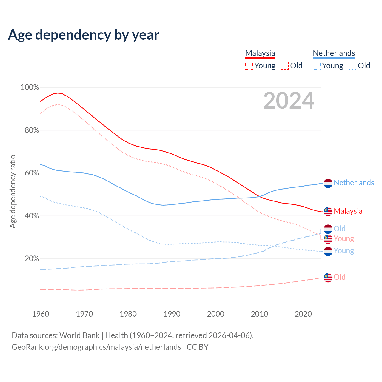 - Malaysia is ranked 92/196 by median age (oldest to youngest) vs 33/196 for the Netherlands.