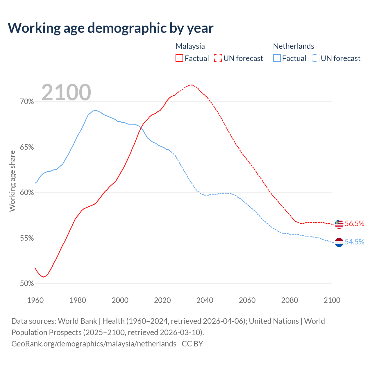 Median age Malaysia vs Netherlands, 1960-2100