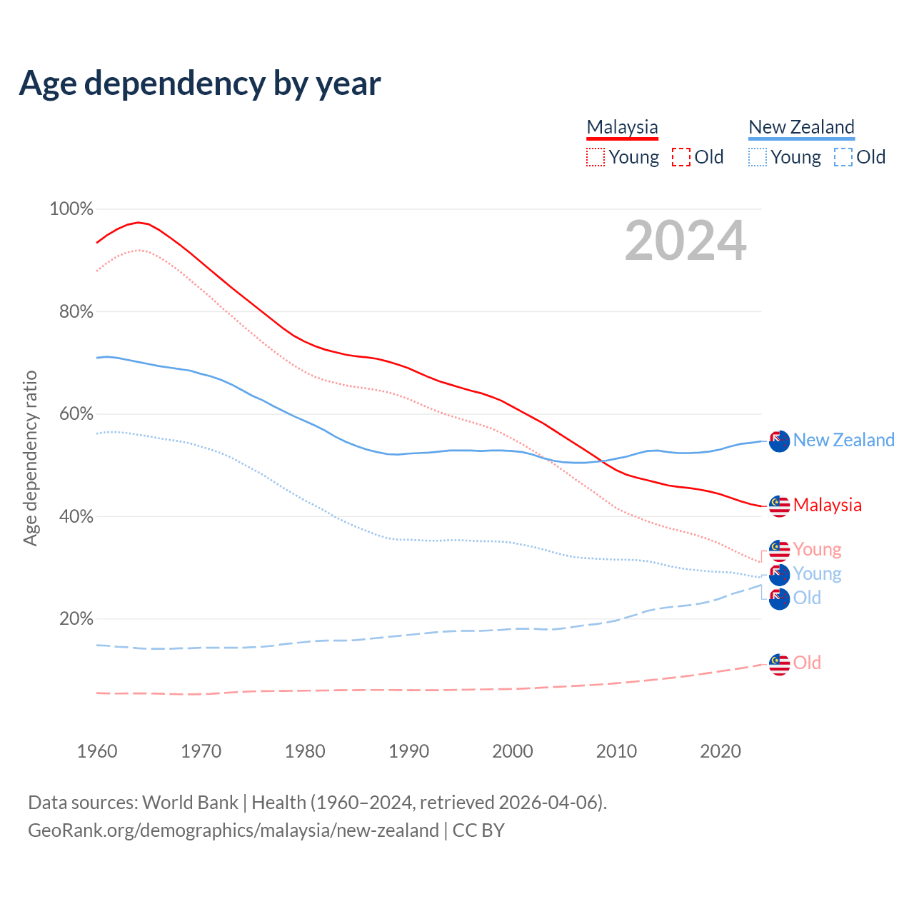 - Malaysia is ranked 92/196 by median age (oldest to youngest) vs 56/196 for New Zealand.