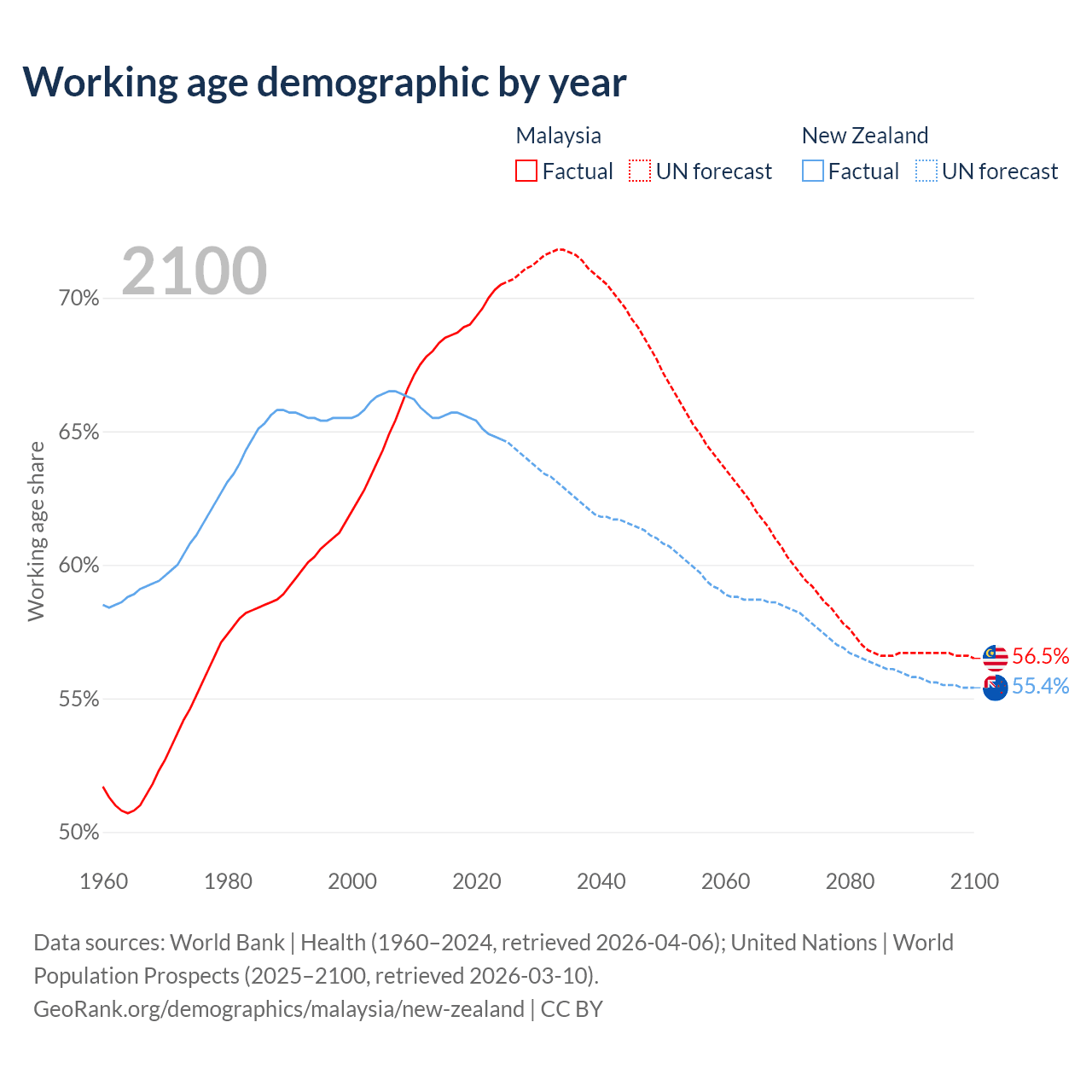 - Malaysia has 25.7M working age adults (aged 15-64) vs 3.48M in New Zealand.
