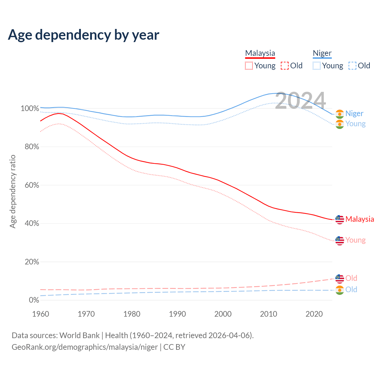 Data sources: World Bank | Health (1960–2024, retrieved 2026-04-06); U.S. Census Bureau (1960–2024, retrieved 2026-02-08).